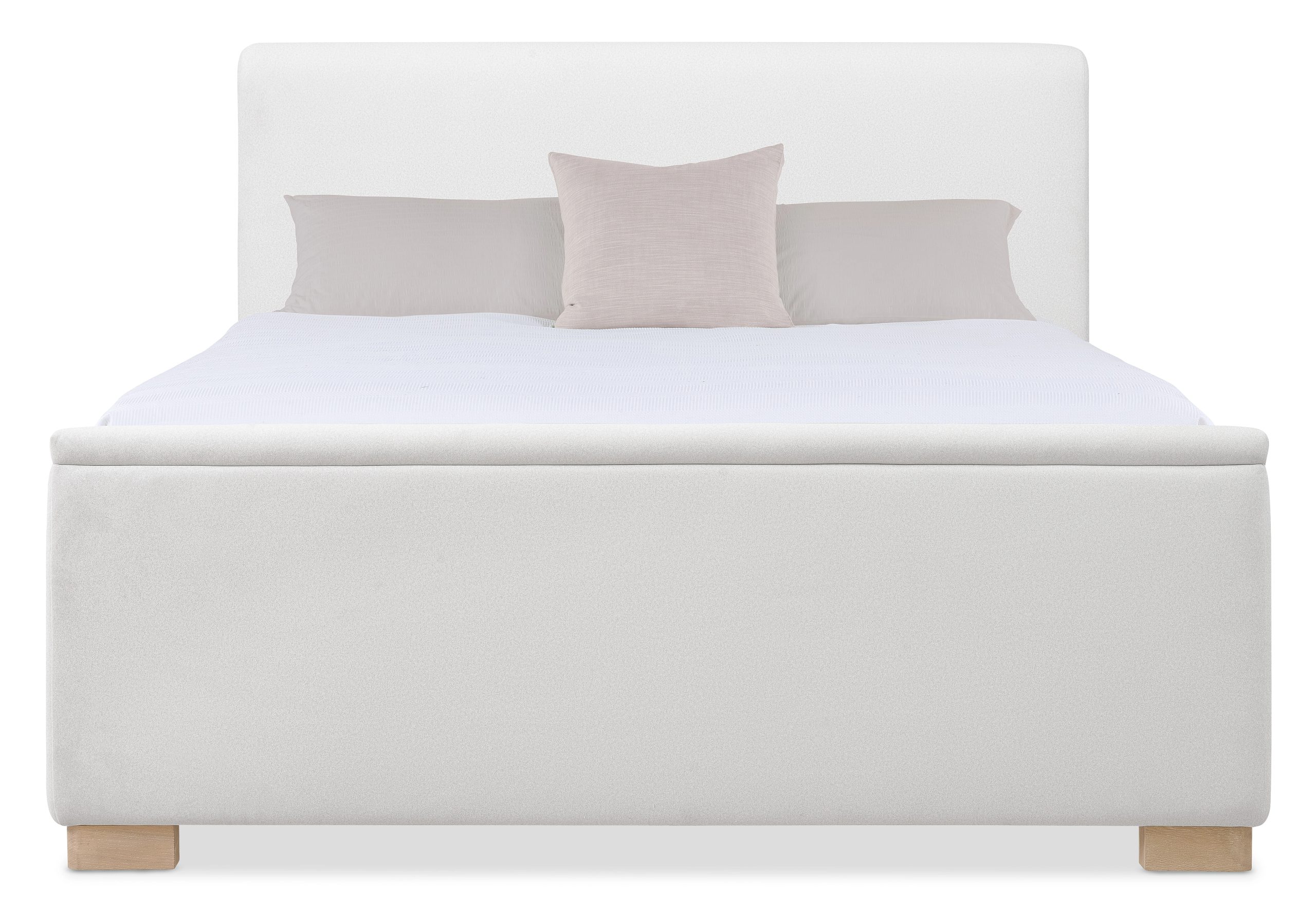 Make a bold statement with the Banyon Bay King Upholstered Bed. Upholstered in soft Merino Buff fabric, this bed offers a fully padded design with sleek wood block feet, combining comfort and contemporary style. Crafted from white oak solids and oak veneers, the light Desert Oak finish with wire-brushing and cerusing adds texture and depth to the piece. Includes a headboard, footboard, and rails to complete your modern bedroom look.