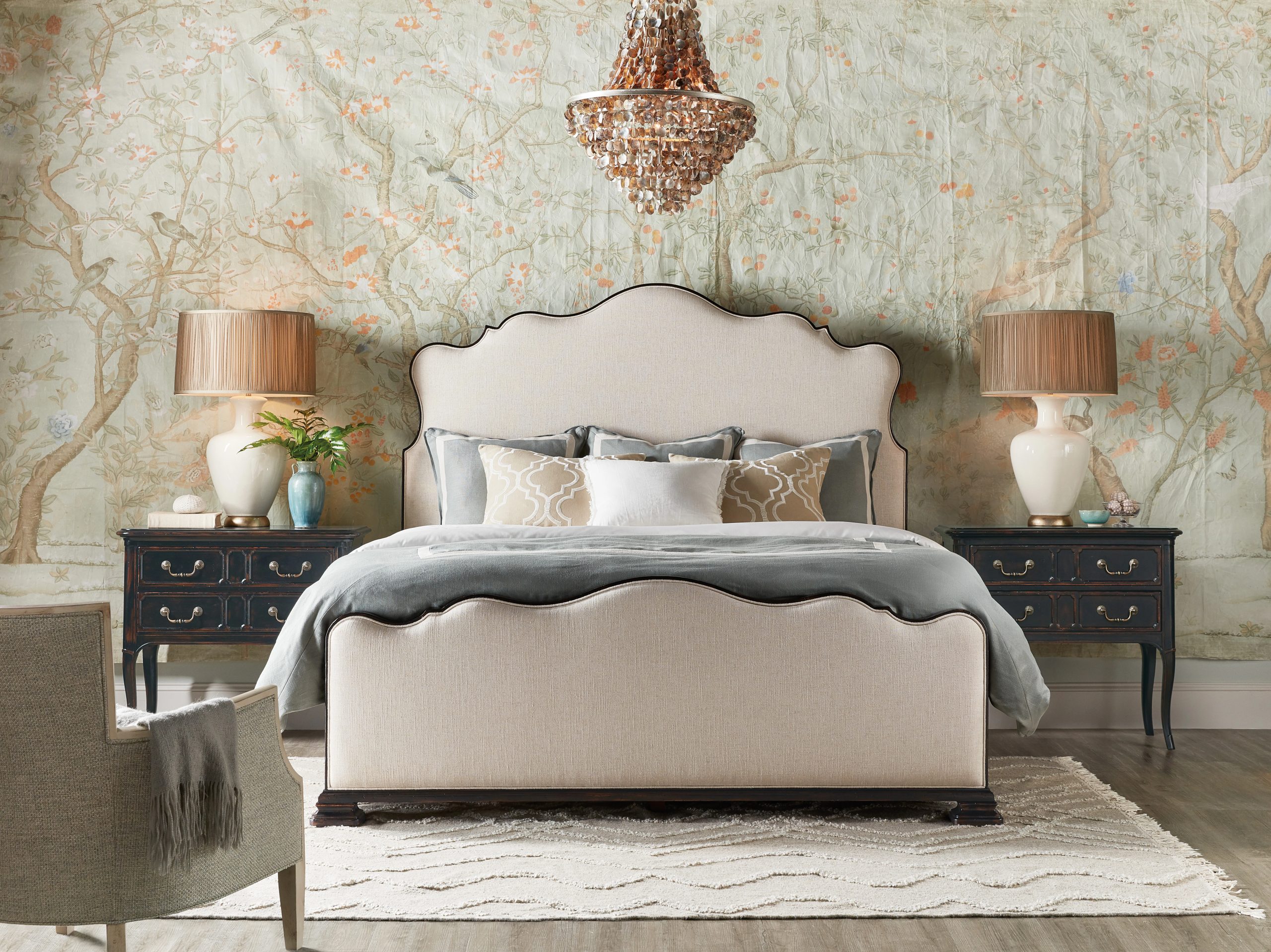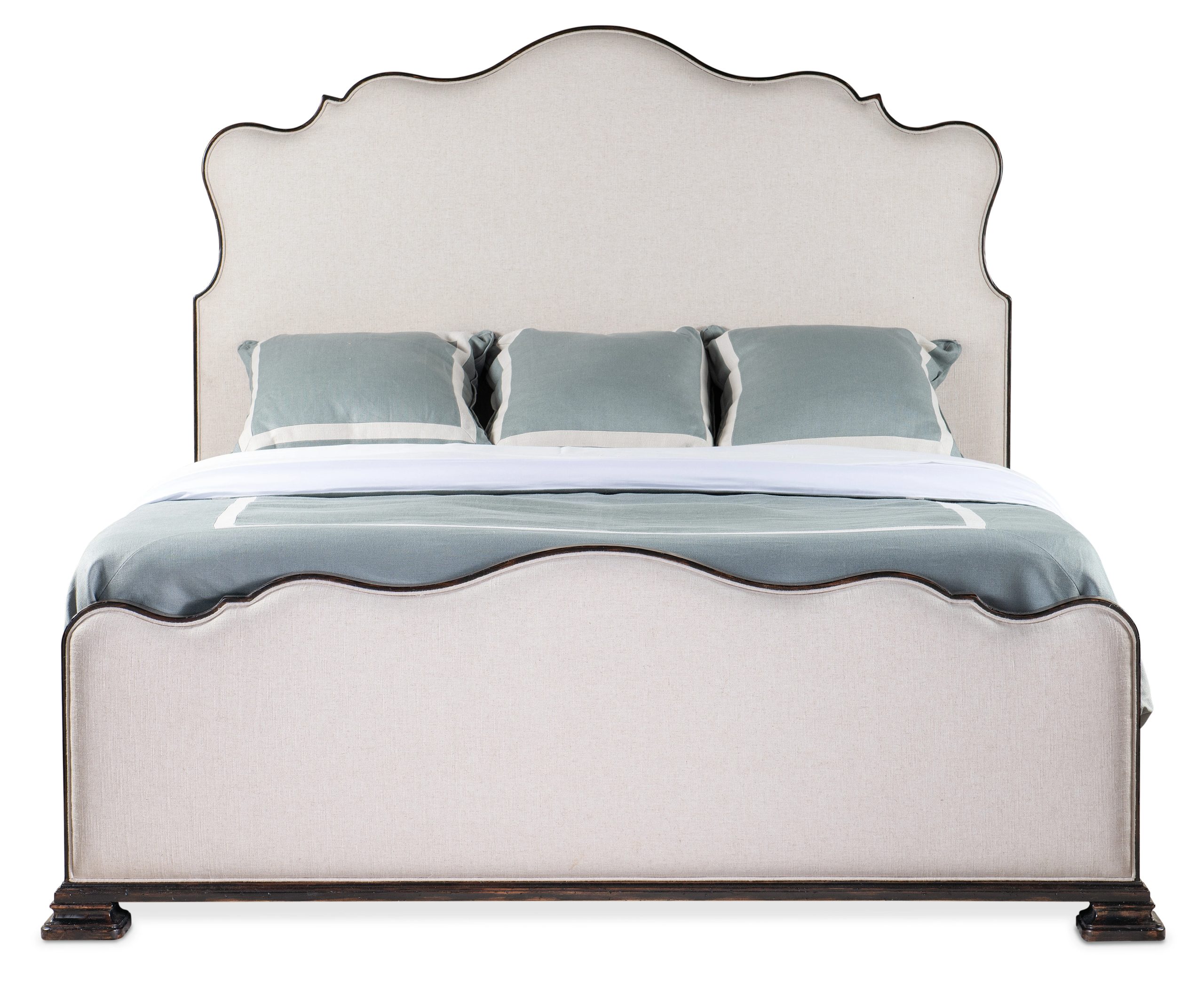 The stunning Charleston California King Upholstered Bed marries a traditional soul with a hint of cosmopolitan chic. Contrasting the rich Black Cherry heirloom finish on the wood trim, side panels and feet with the Chateau Linen upholstery on the scalloped-edge headboard and footboard, the bed is crafted of Cherry Veneers and fabric.