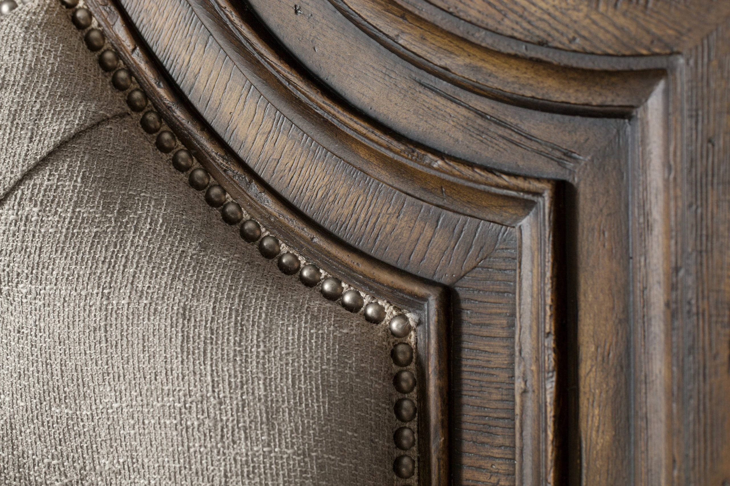 This stunning button-tufted upholstered king bed with an elaborately carved and shaped head and footboard imparts an authentic American character. The rich two-tone finish combines an aged black, used in the middle of the generously-scaled footboard, while the timeworn saddle brown finish is used on the carved headboard and the carved border of the footboard.