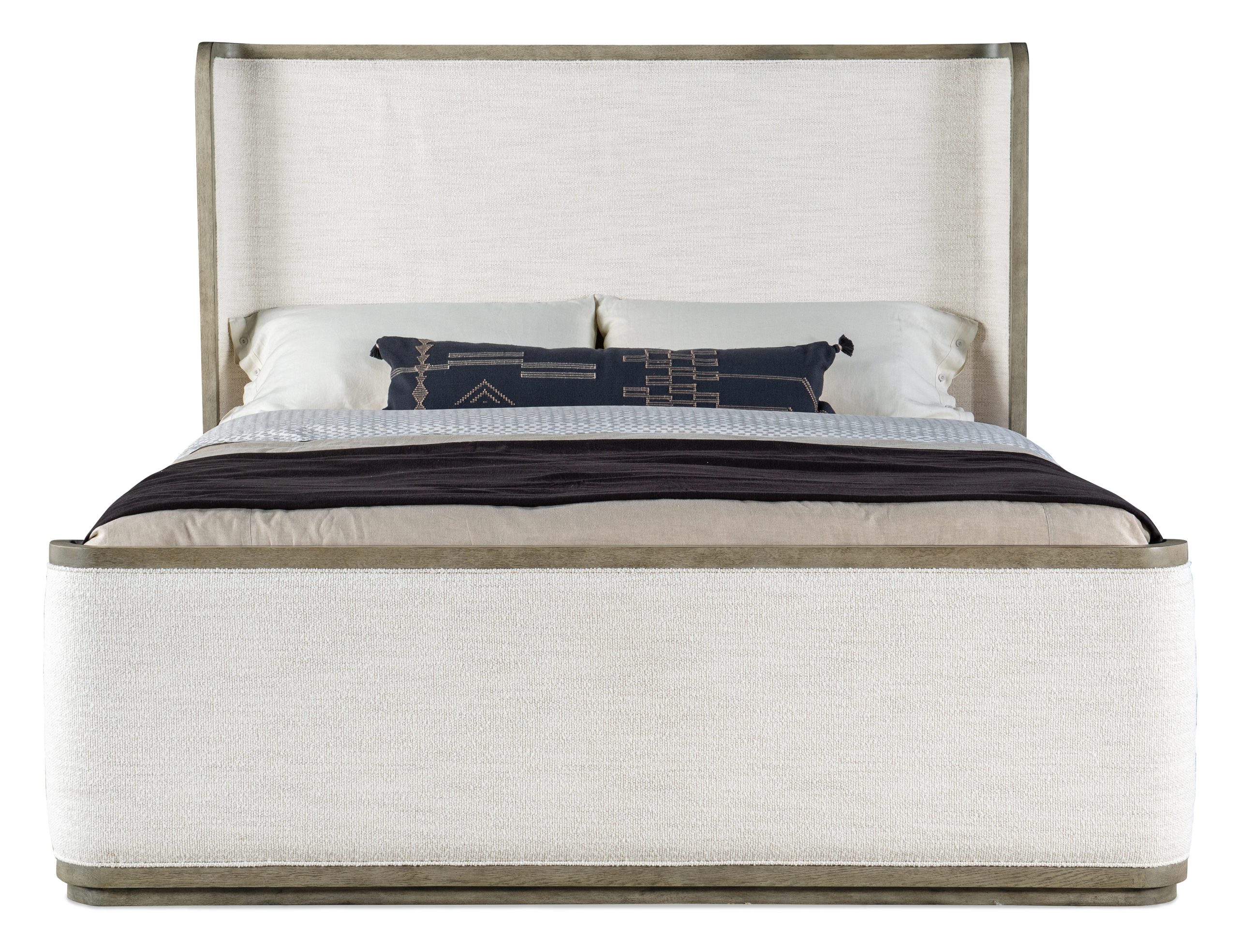 Enveloping and inviting, the Boones California King Upholstered Shelter Bed offers a soothing and stylish refuge at the end of a long day. The striking modern sleigh bed silhouette features a wood border around the headboard, footboard and rails and is upholstered in the soft neutral Merino Pearl Performance fabric. Includes headboard, footboard and rails.