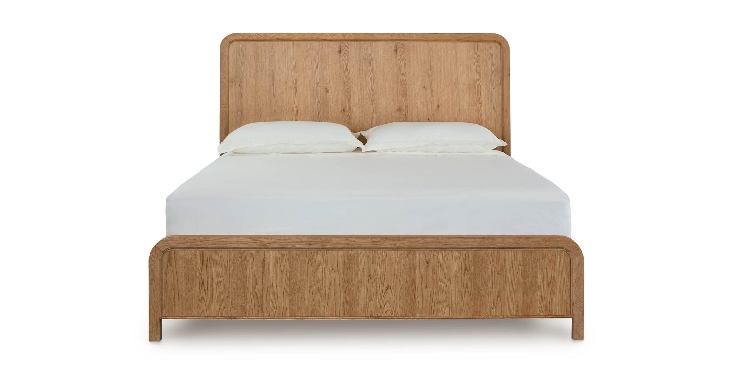Soft rounded corners on the paneled white oak headboard and footboard enhance the sleekly architectural appeal of our Newbury Panel Bed. A tracing groove around the outer frame adds dimension to the textured oak, while the clean line of the bed rails anchors the overall look in a straightforward statement of modern style. Available in either of the two Newbury signature finishes, complete bed or headboard-only options can be ordered in Queen, King, and California King sizes.