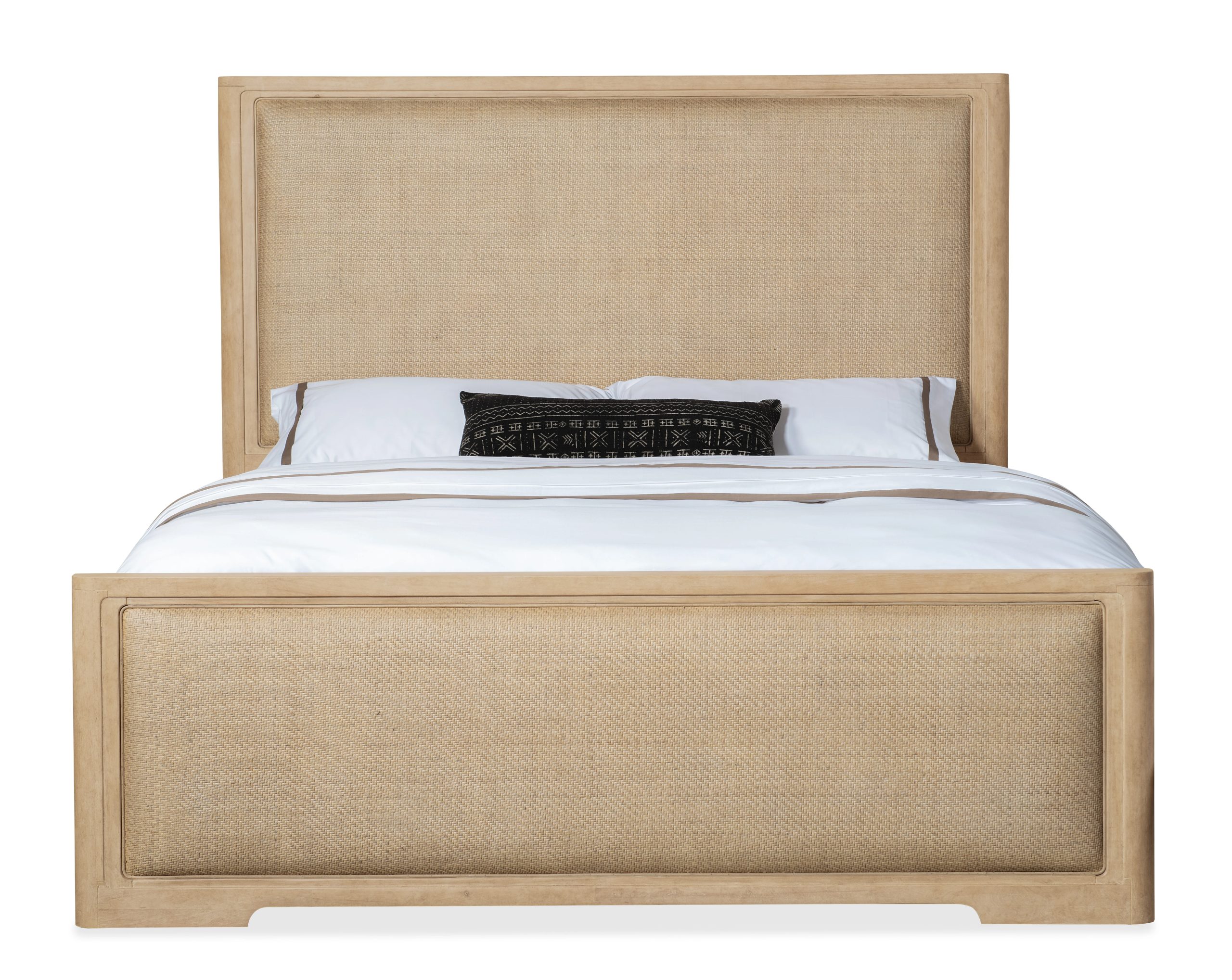 Modern Zen meets island oasis in the stunning, welcoming Retreat Raffia Panel Bed. Featuring a clean, serene silhouette crafted of wood with cane panel inserts, it is finished in the sand-colored Dune, transparent by design to showcase the unique grain patterns in the wood veneer. Bed includes the headboard, footboard and rails.
