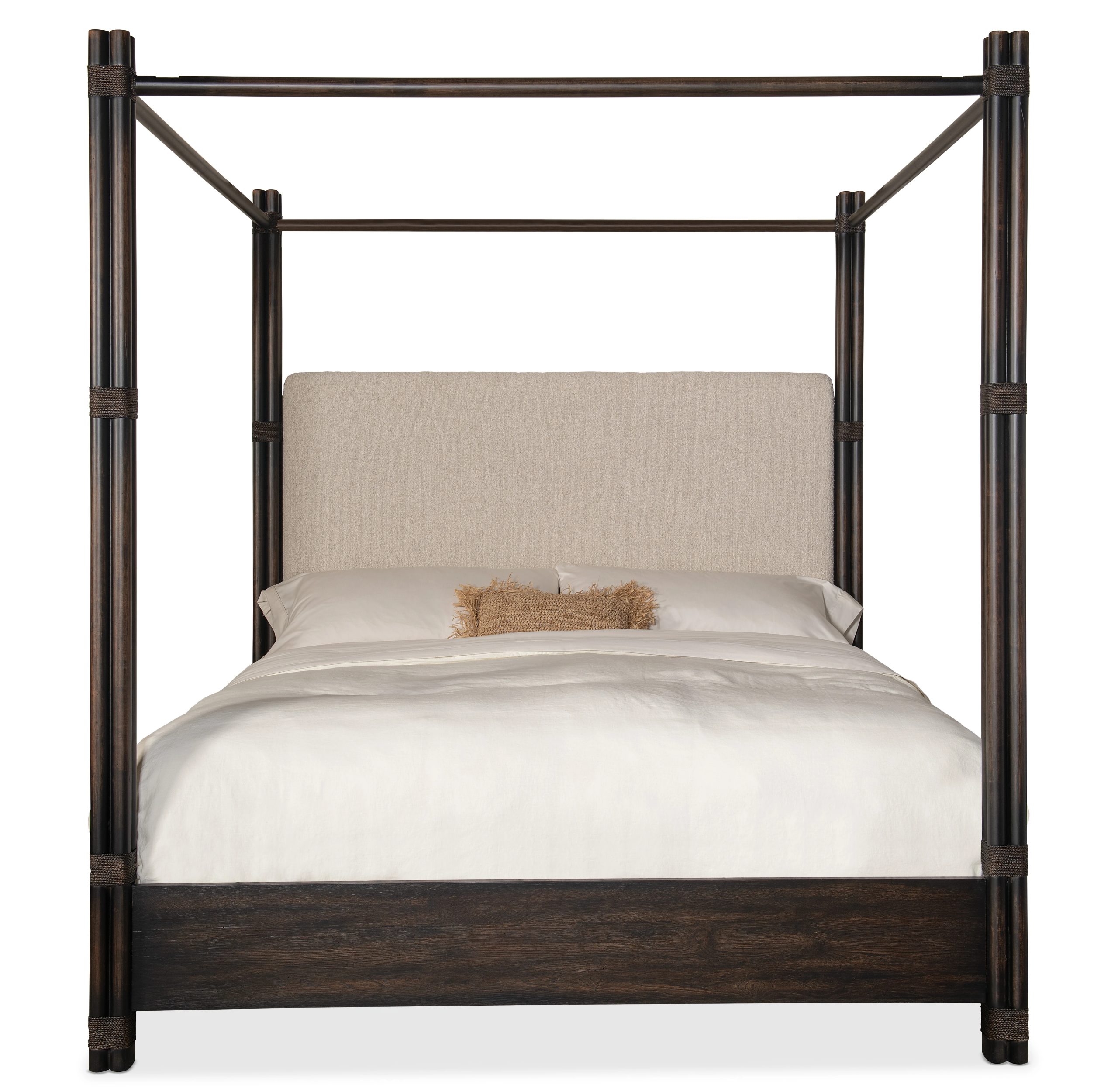 Create a personal oasis inspired by tropical getaways with the Retreat Pole Rattan Upholstered Bed with Canopy. The dramatic bundled pole-designed motif with rope accents creates a laid-back luxury, complemented by the side rails crafted of Oak Veneers and finished in the Black Sand finish, transparent by design to reveal the unique character of the wood veneer. The Neo Cream fabric on the upholstered headboard adds inviting softness and comfort. Includes headboard, footboard and rails.