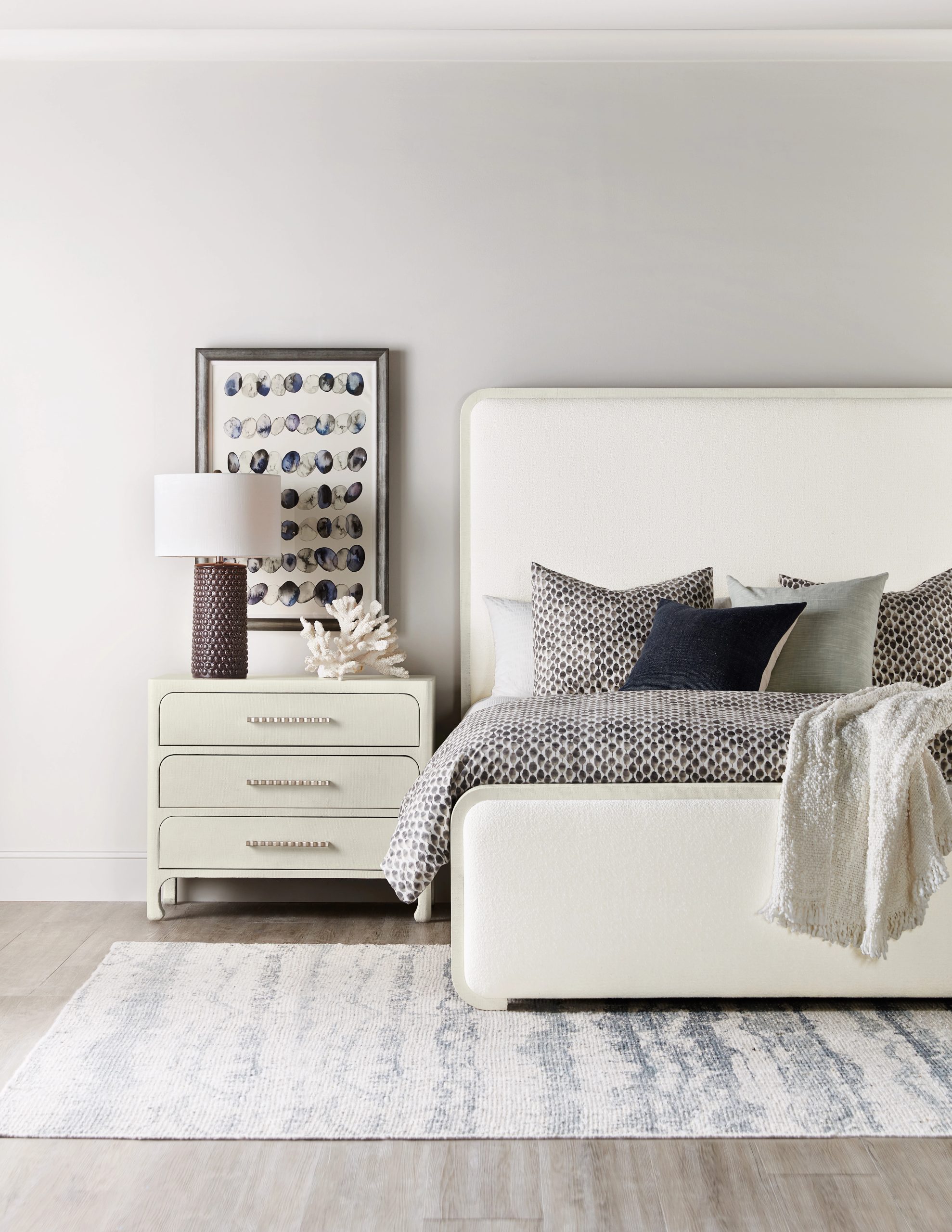 Create a tranquil bedroom retreat in a soft creamy white palette and soft silhouette with the Serenity Ashore Queen Upholstered Bed. This striking bed combines the Macrame Artic fabric on the upholstered headboard with the Sand Dollar white lacquered glasscloth border on the headboard and a grasscloth footboard and side rails.