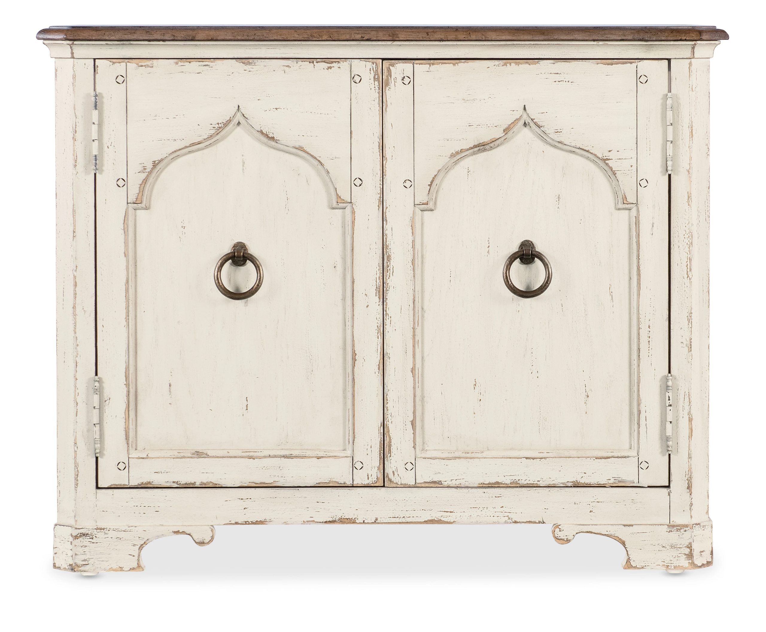 Reimagining an historical piece with a fresh take on finish, function, hardware and form, the Americana Two-Door Nightstand has shaped carved door fronts with an architectural arched design and scroll accents on the base. The two-tone finish pairs the timeworn white Daisy on the case with the warm Honey on the top and drawer interiors. The two doors have magnetic catches and one adjustable wood shelf behind the doors. Crafted of Oak Veneers, the nightstand has a solid-wood edge top.