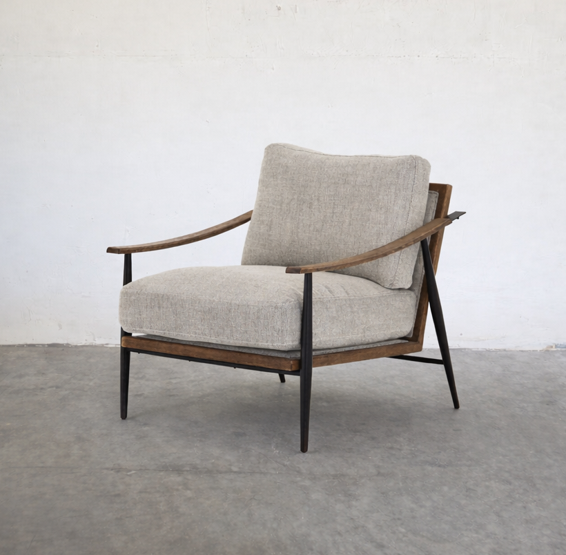 Comfort and class in one chic silhouette. Sloped wooden arms and forged, gunmetal-finished legs frame cushy feather-blend seating covered in a textural grey twill, striking great tonal balance between warm and cool.