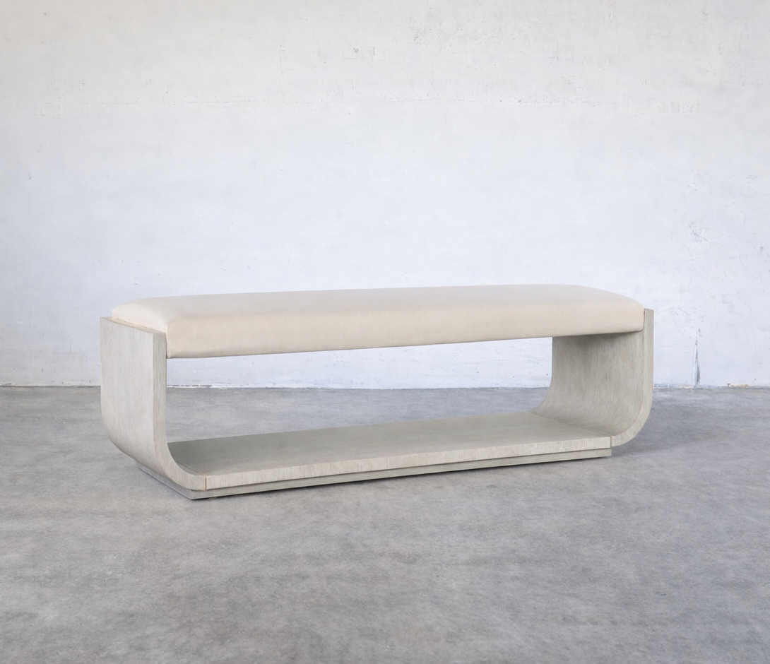 Serene, soft and stylish with a cloud-like floating appearance, the monochromatic Modern Mood Bench is upholstered in a cozy Boucle fabric and finished in the crystal-like Diamond color with wire-brush detailing. The base is crafted of Quartered Oak Veneers.