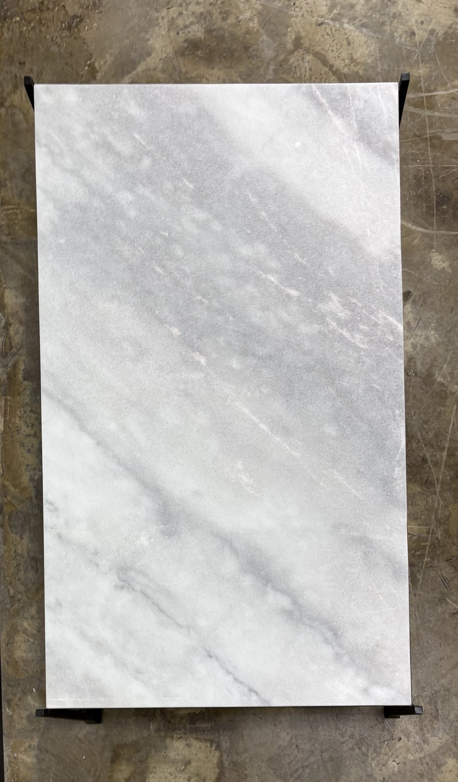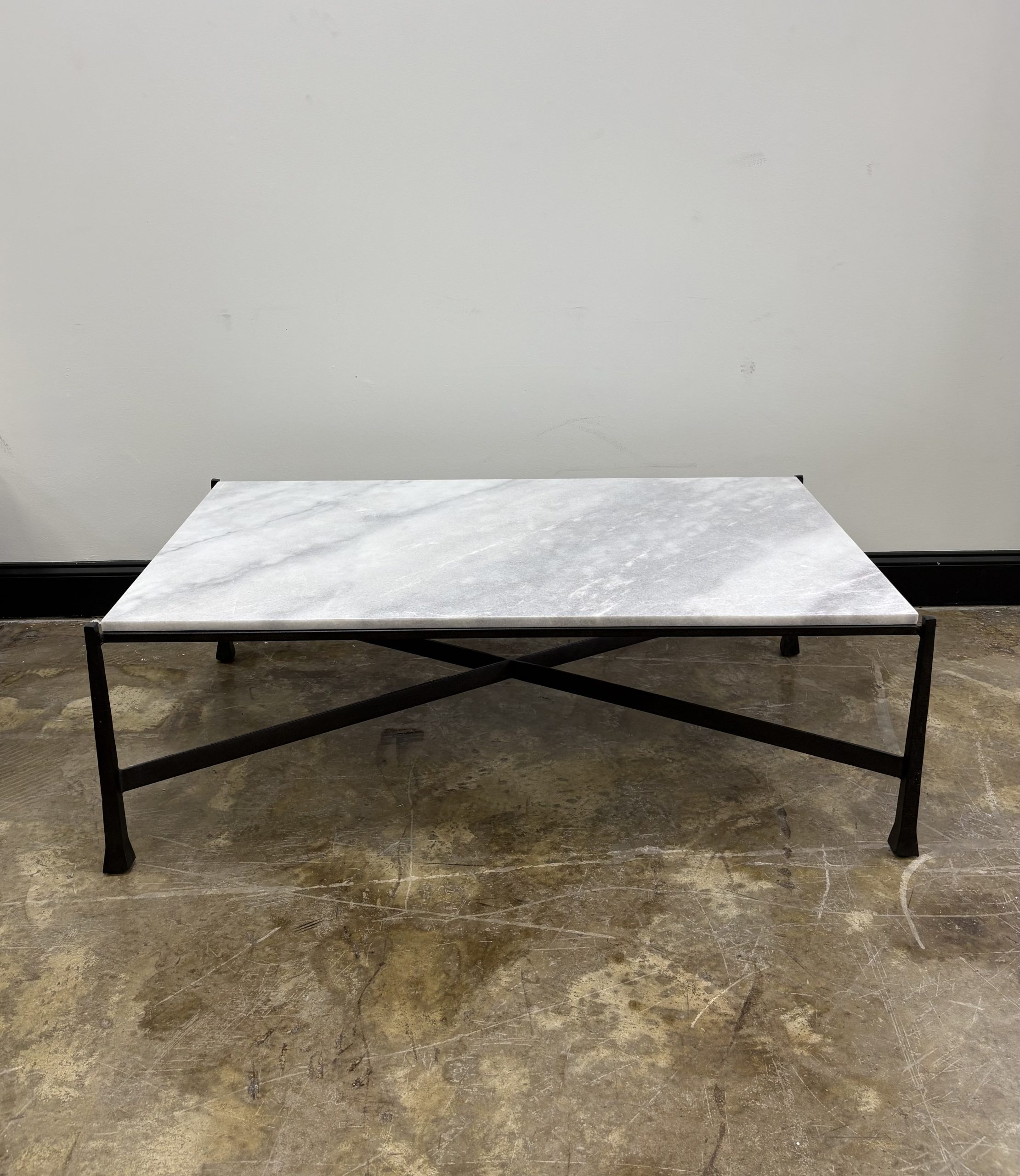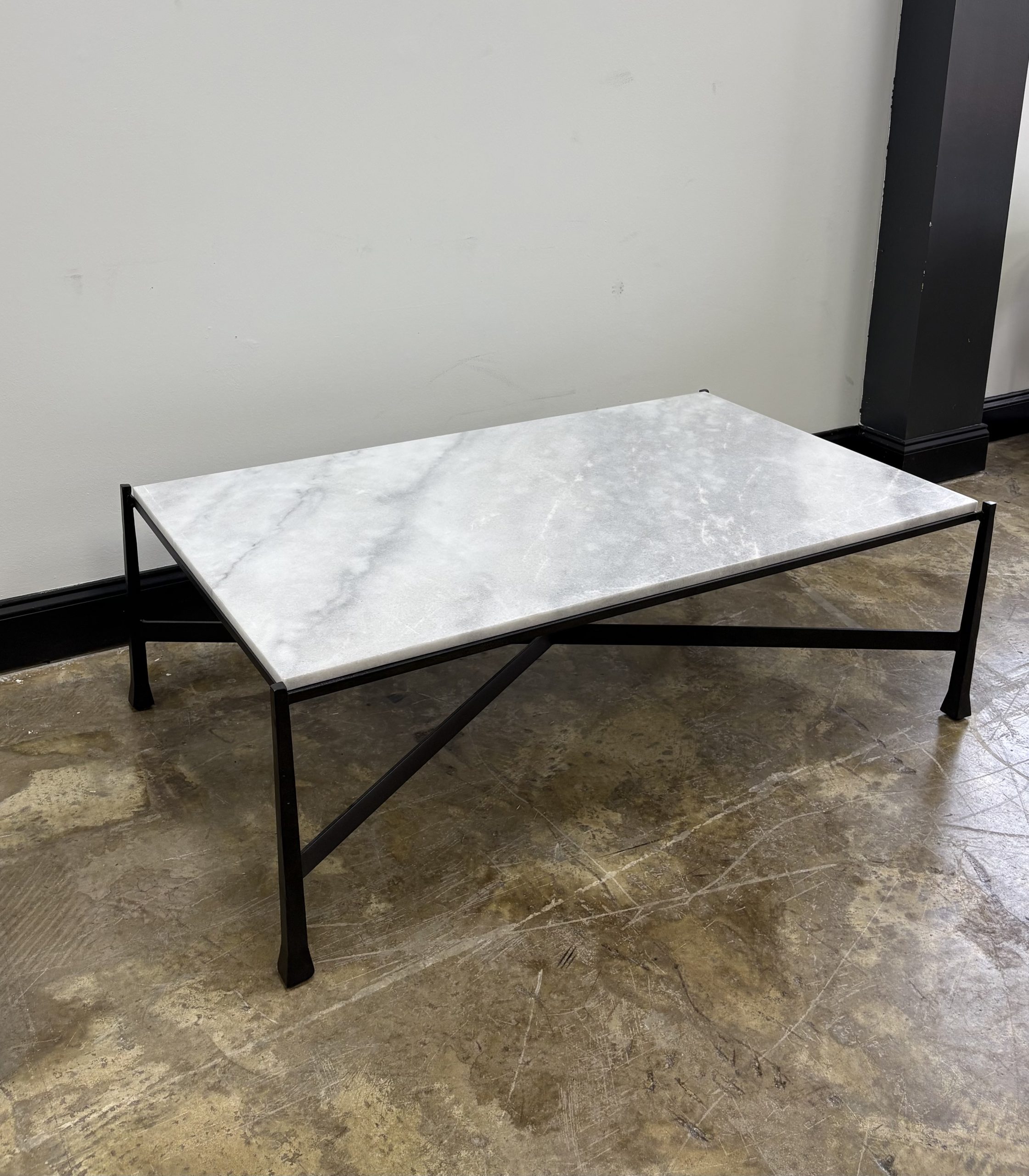 A stylish standout in any room, the Whitestone rectangular cocktail table sets the tone with its elegant natural stone top and shapely cast iron legs. The 1 ¼” thick table top in lustrous Mexican lagoon marble dazzles with unique color ranges, from white to gray to pale pink. The slender legs and cross-piece of the textured cast iron base are powder coated with dramatic ebony, with levelers to ensure an even surface.