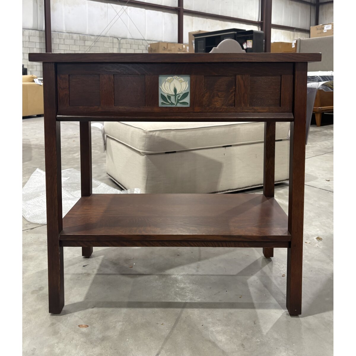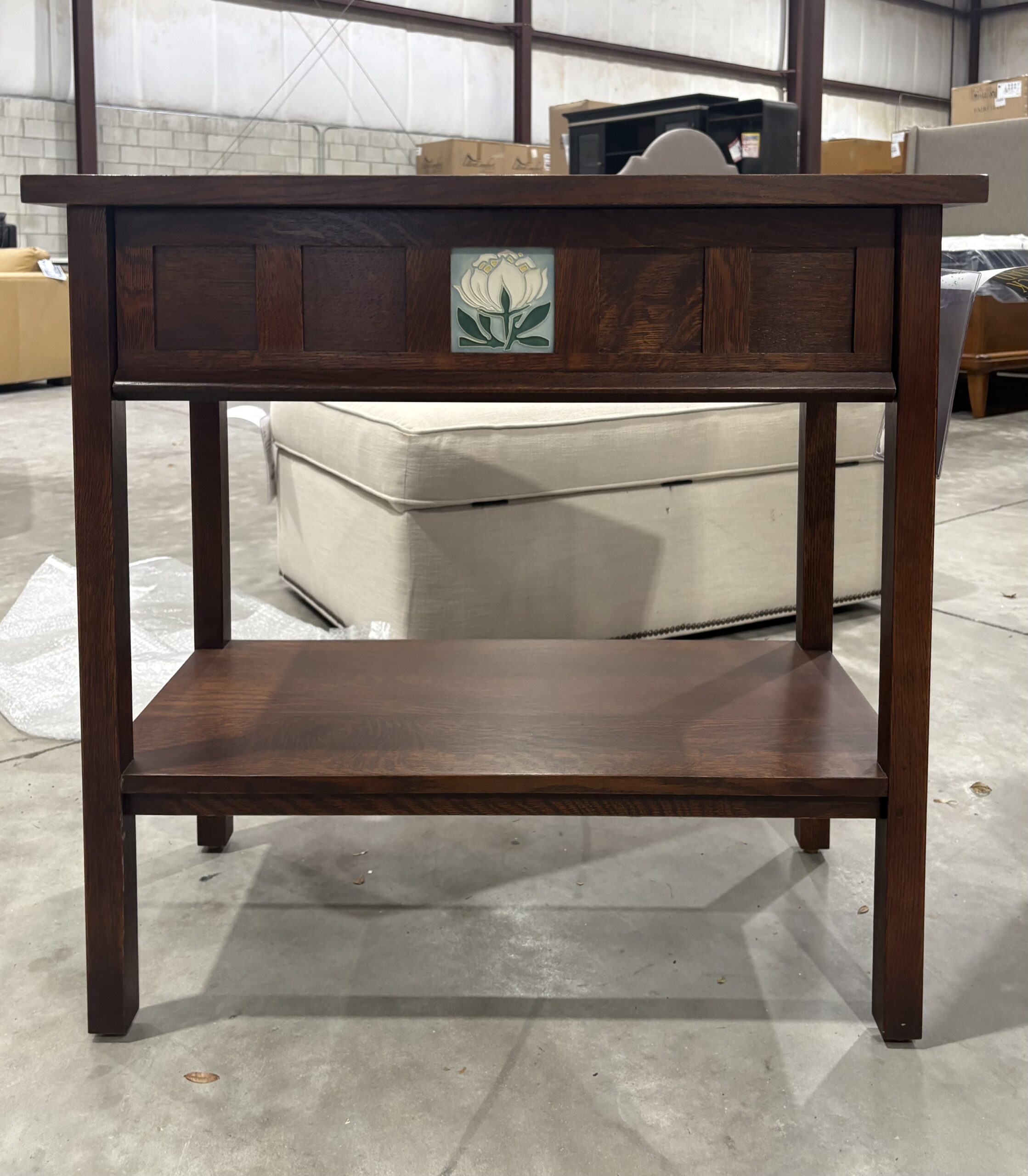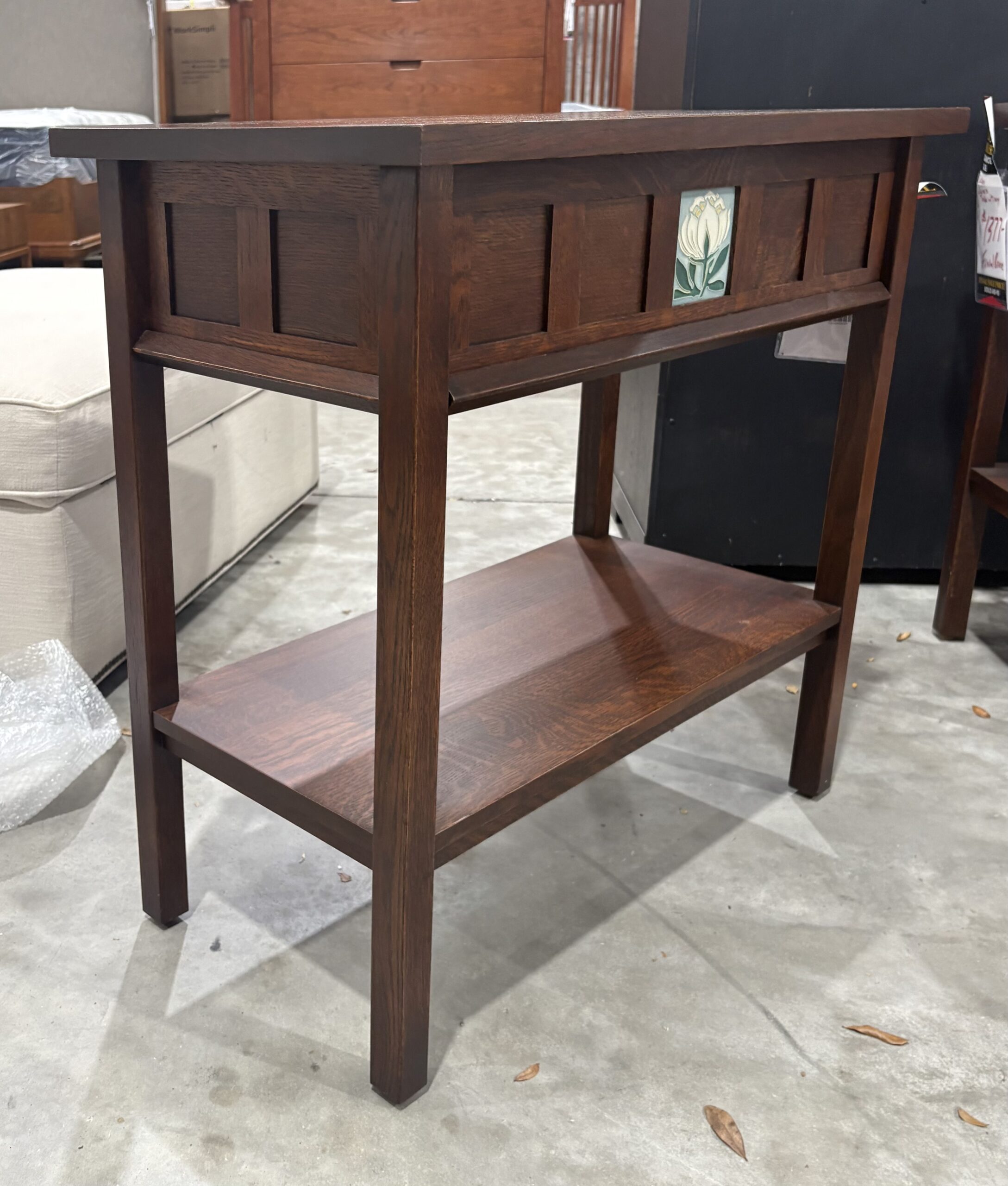 In honor of the 125th anniversary of Stickley’s founding, the Floral Tile Collection has been thoughtfully designed to lend beautiful Mission personality and function throughout your home. The Console, suitable for use as a side table, entry table, or nightstand, features an attached slab top and a lower fixed shelf. A wide side-hung, center-guided drawer includes an interchangeable Motawi Peony Bloom tile, held in place inside the drawer with swiveling clips. Each piece in the collection is crafted in the USA of solid quartersawn white oak with mortise-and-tenon joinery.