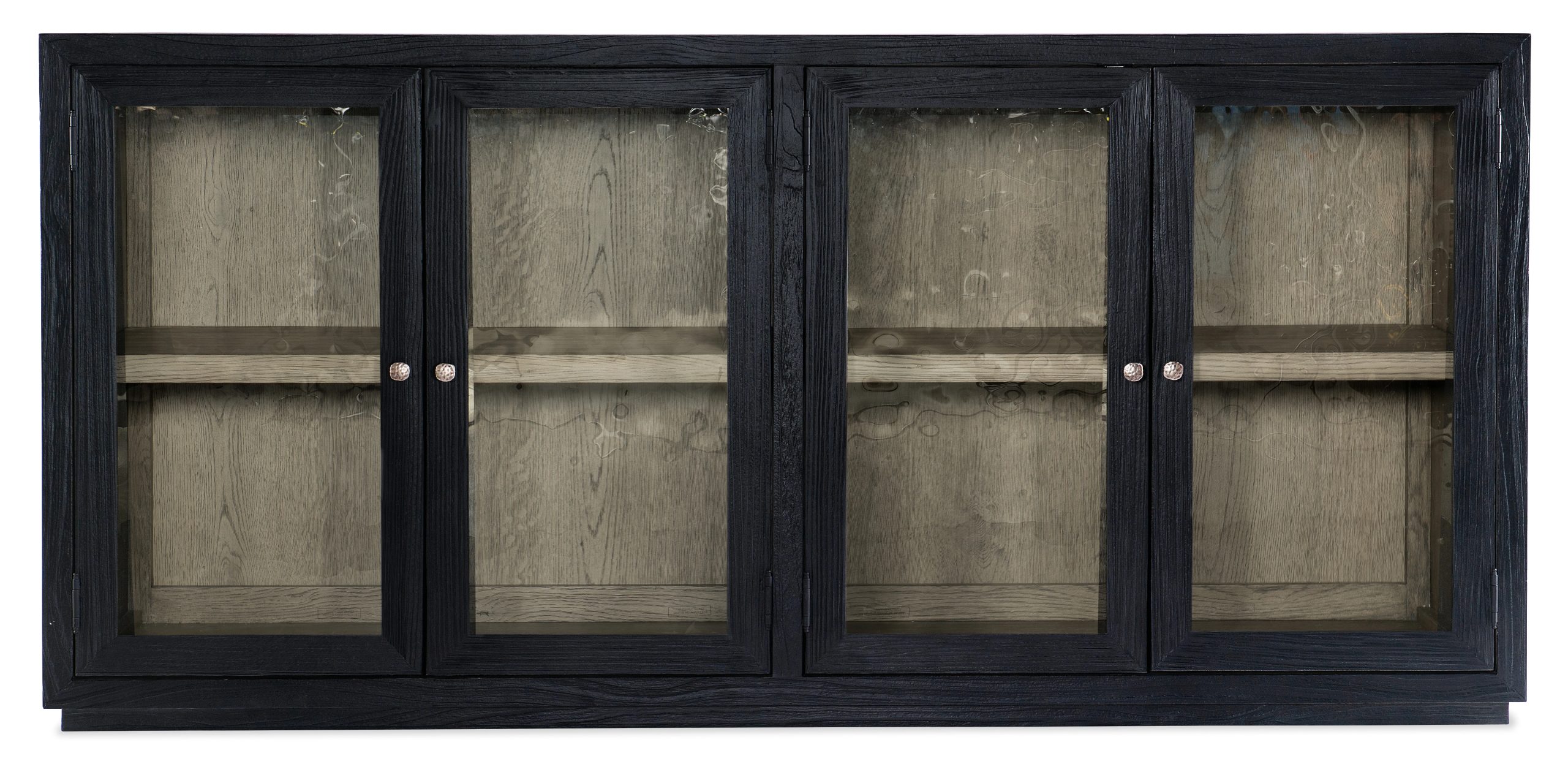 | Four wood-framed doors with seeded glass insertsTwo adjustable shelves behind each pair of doorsInterior is finished in Mink, a soft smoked gray finishFinish: Shadow: a charred black finish achieved through Shou Sugi Ban, a Japanese technique that creates | Yes |