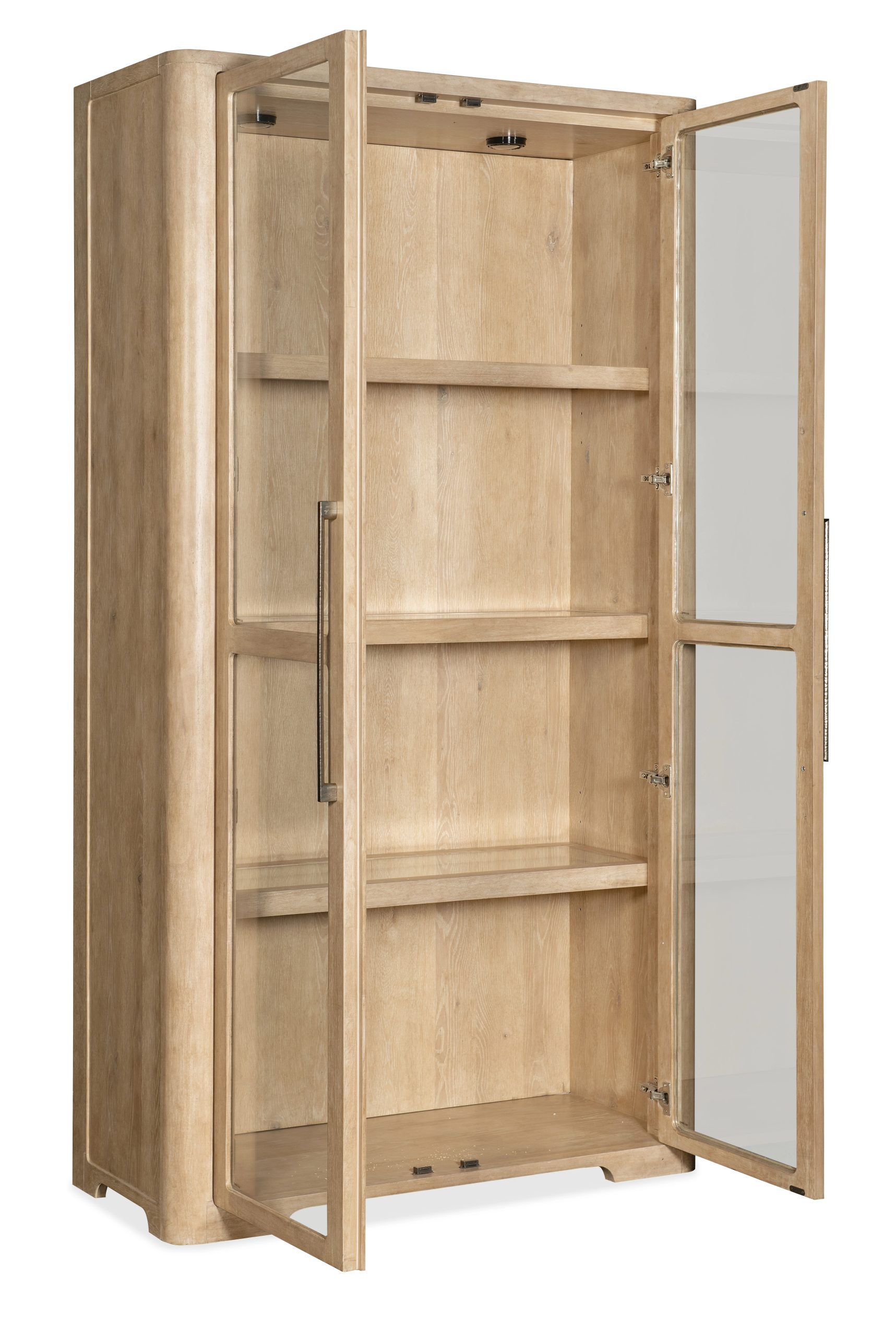 Serene and stylish with a modern allure, the Retreat Display Cabinet is a striking focal point piece. Crafted of Oak Veneers, it is finished in the sand-colored Dune, transparent by design to reveal the unique grain patterns of the wood veneer. Featuring softly-shaped bracket feet, it has tempered glass doors with magnetic catches and soft pewter bar pulls. Behind the doors, the top and bottom shelves are wood-framed glass and adjustable, while the middle shelf is wood-framed glass and fixed. There are plate grooves on all shelves, and two lights in the top with a three-intensity touch switch on the right side of the back panel.