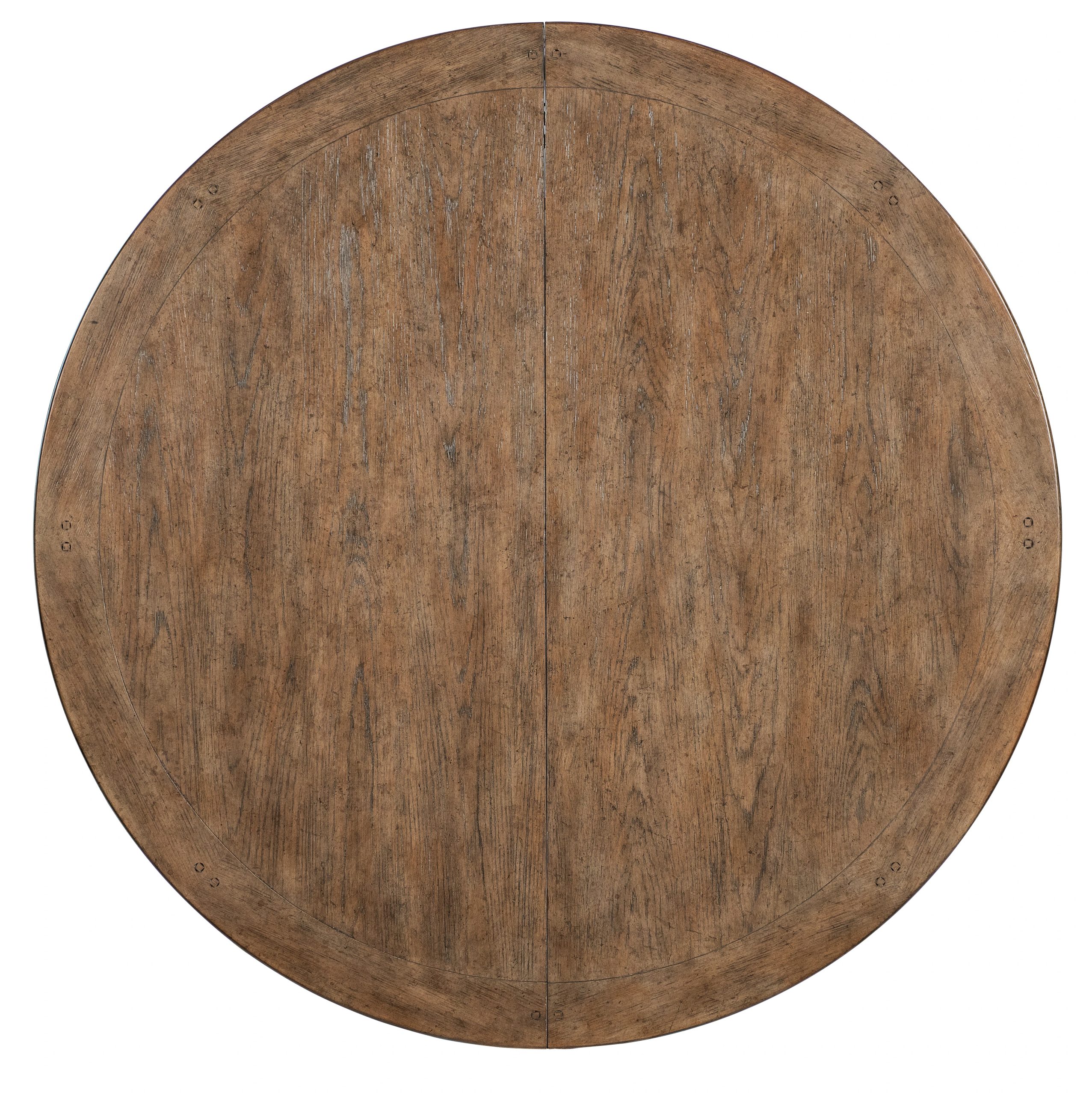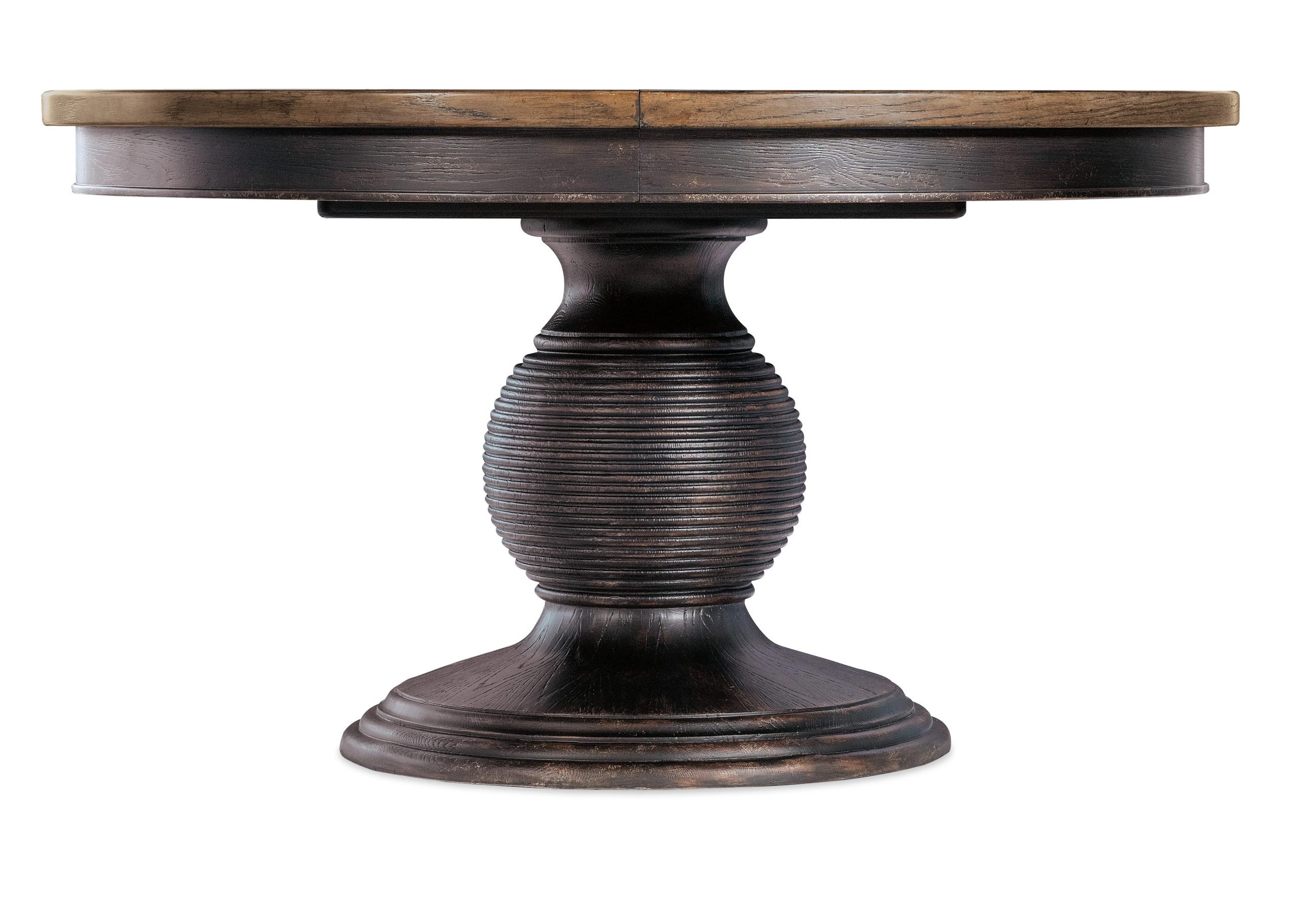 The Americana Round Pedestal Dining Table harkens back to a simpler, more genteel time. Crafted of Oak Veneers with a Solid-Wood Edge Top, it has a carved pedestal base. With the 22-inch leaf in place, the table extends to 76 inches round and accommodates up to two coordinating benches and two armchairs and up to 8 coordinating armchairs or side chairs. Without the leaf, it accommodates up to 6 coordinating arm or side chairs.