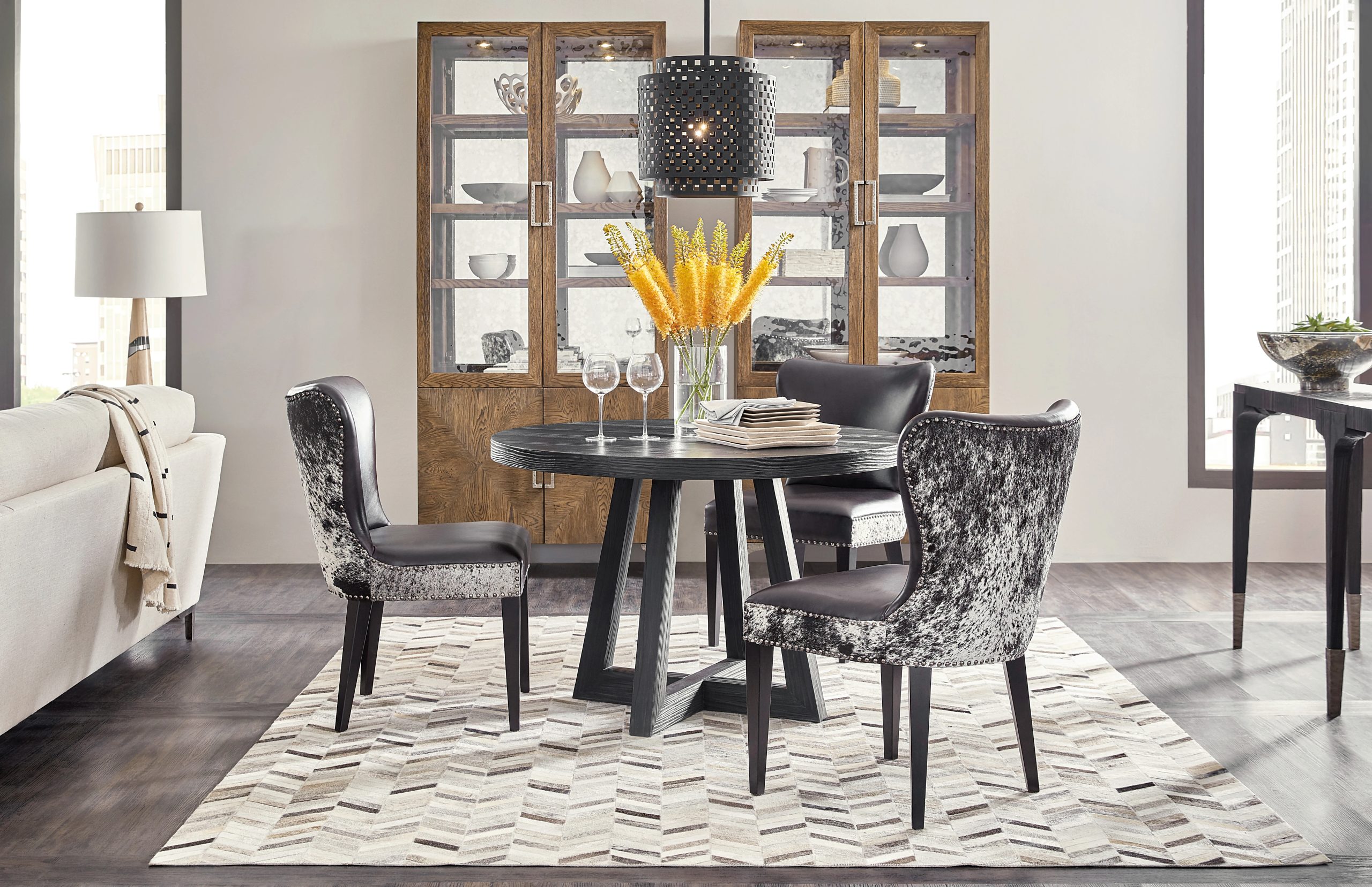 In a chunky and chic silhouette, the Chapman Round Dining Table is casual with a modern twist and features a Charred Black finish on Pine Veneers, a Japanese technique to achieve the look of burnt wood. Will accommodate up to 6 chairs.