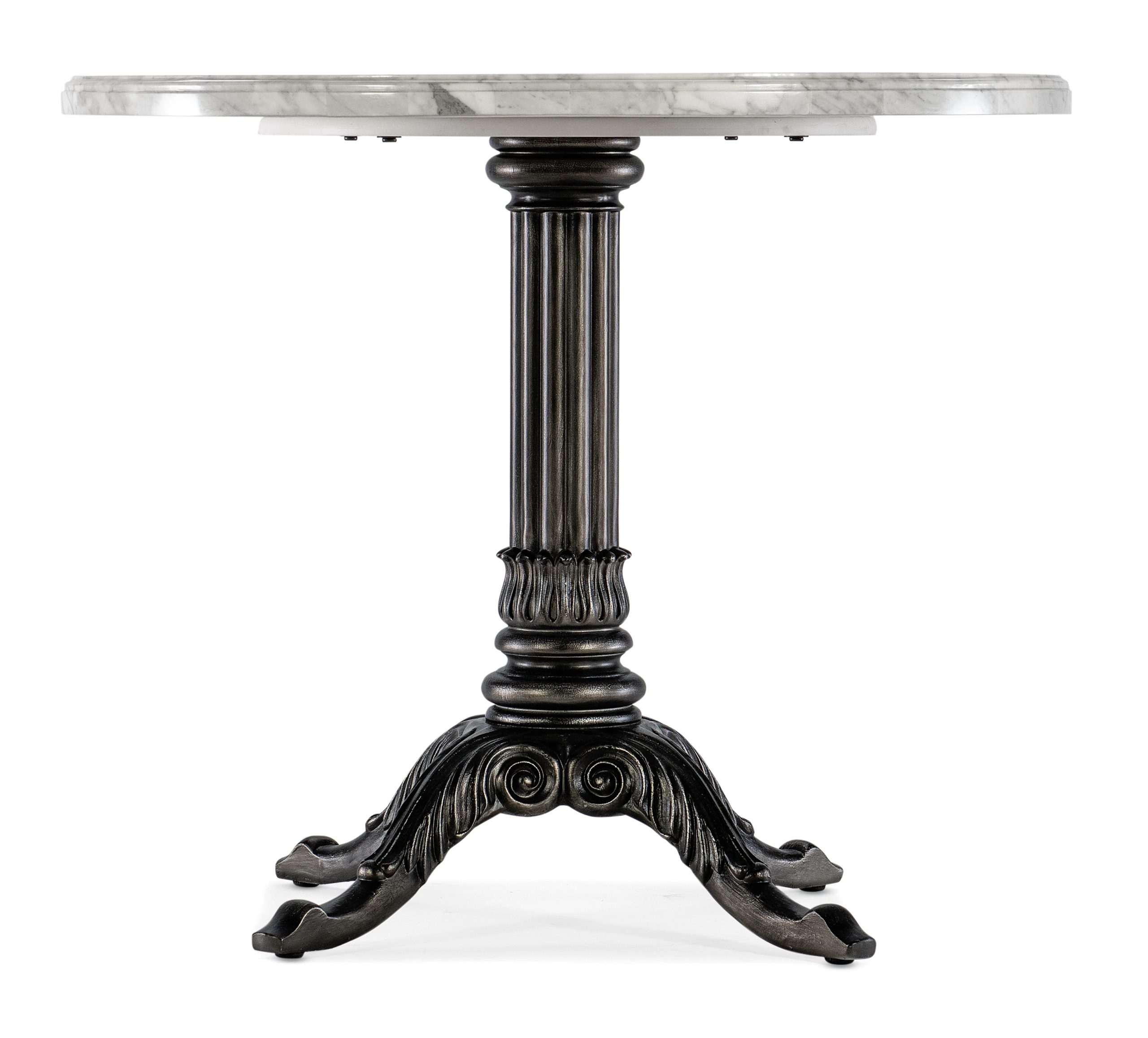 Inspired by timeless Paris bistro tables, the Charleston table is a classic design with a Veneered Carrara Stone top and a carved pedestal base that takes its’ inspiration from the decorative iron gates that adorn the stately properties in Charleston. Will accommodate up to 4 with coordinating chairs.