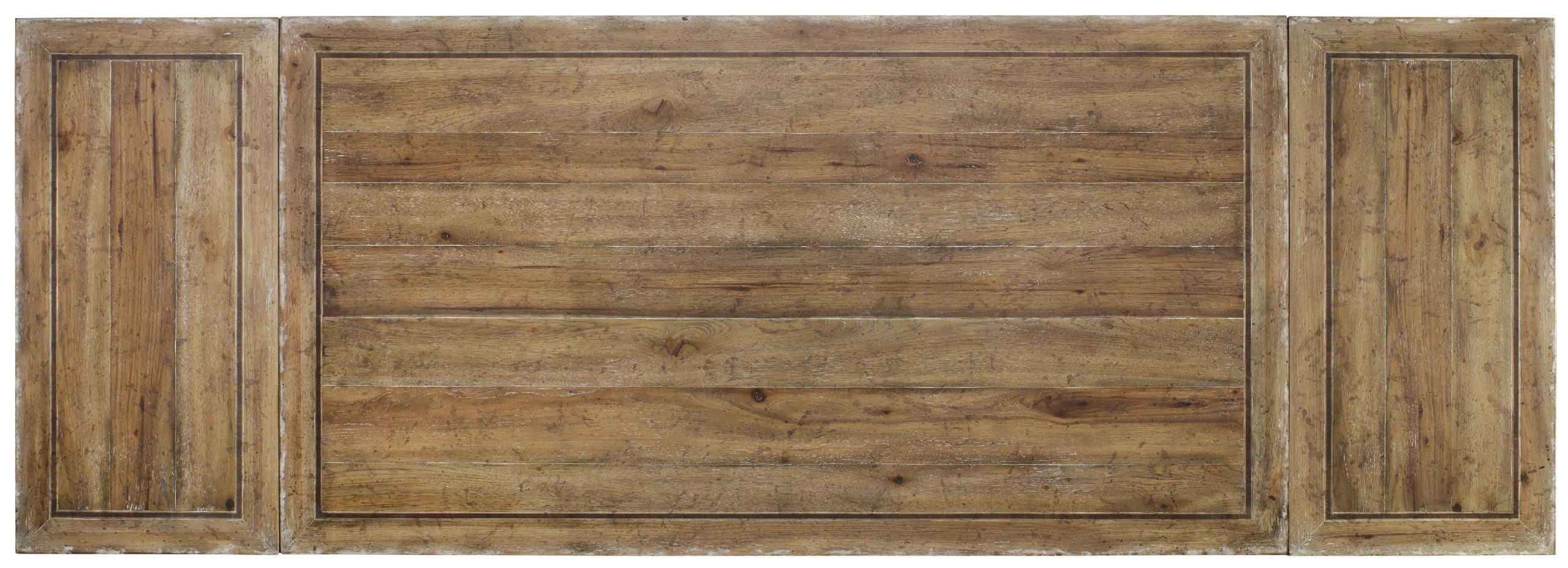 Dine in livable luxury with this stunning Chatelet Refectory Trestle Dining Table. With both 22-inch leaves extending the table, you can welcome up to 10 guests. Crafted of Poplar and Hardwood Solids, the Pecan, Walnut and Maple Veneers tell a rich story in natural wood colors, and the vintage white finish softens the look. The harp-shaped bases on the table add a touch of romantic elegance.