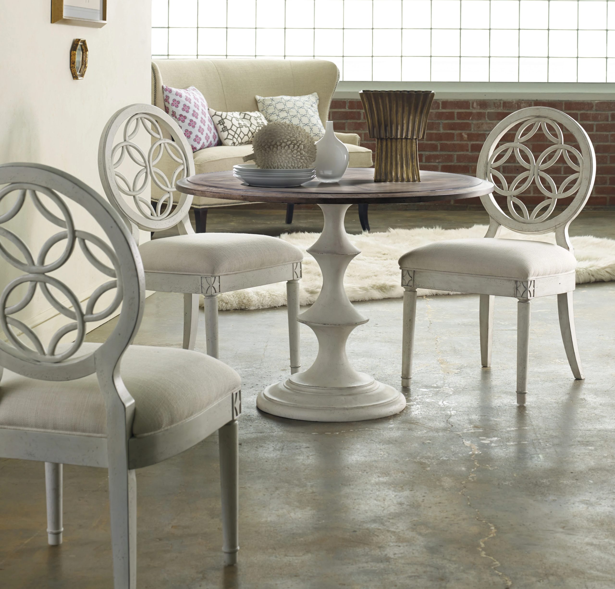 | Table may be used at 30-inch height for dining or 32-inch height as a foyer tableSingle pedestal baseFinish: Medium wood finish over walnut veneers on top with white base.Distressed Finished: Wormholes, rub-through | Yes |