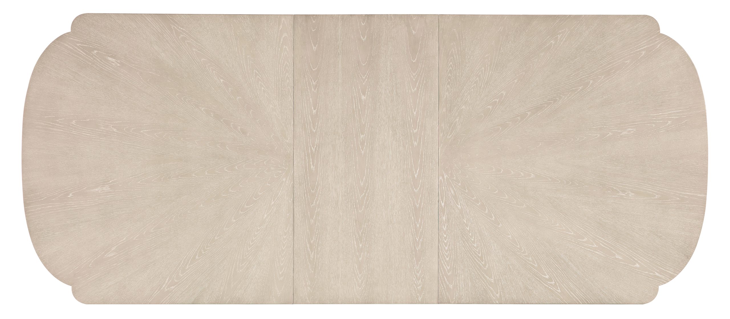 Bring serene style and calm chic to your gatherings with the Nouveau Chic Rectangle Dining Table. Crafted of Quartered and Cathedral Oak Veneers with light wire brushing to create the Sandstone finish, the table has curved, scalloped ends and metal ferrules on the legs, along with a metal accent at the top of the legs. With one 22-inch leaf, the table extends to 104 inches to accommodate 8 guests and six guests without the leaf.