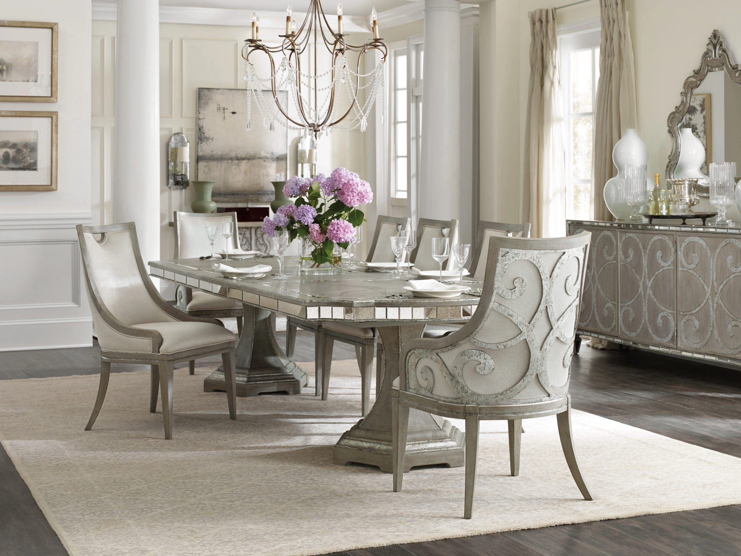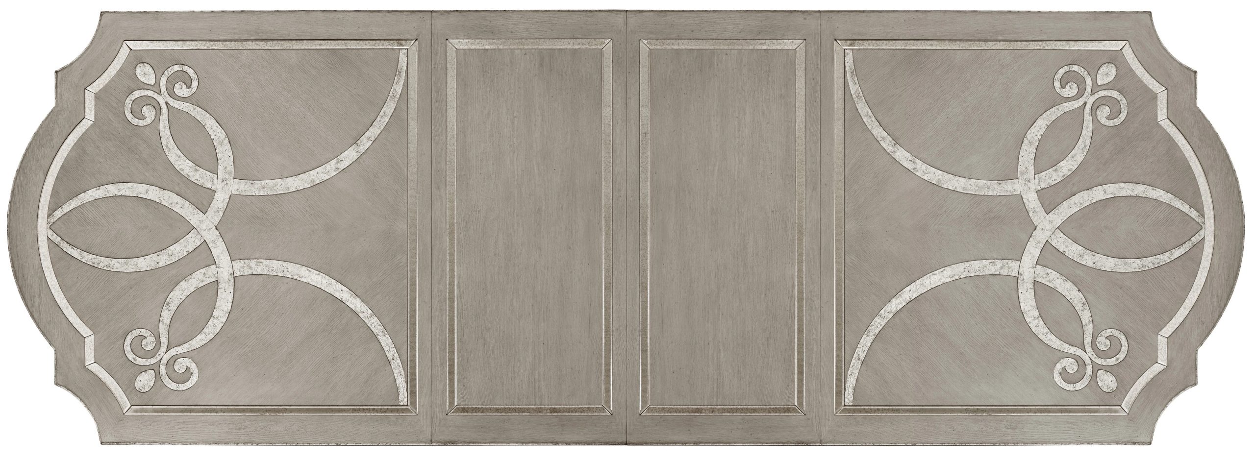 Make every dining gathering a luxe experience with this opulent dining table featuring exquisite scrolled inlays on the top and a mirrored apron. Finished in Epoque, a greige with shimmer on Oak veneers with mirrored accents. Seats 10 guests and extends to 128 inches with both leaves in place.