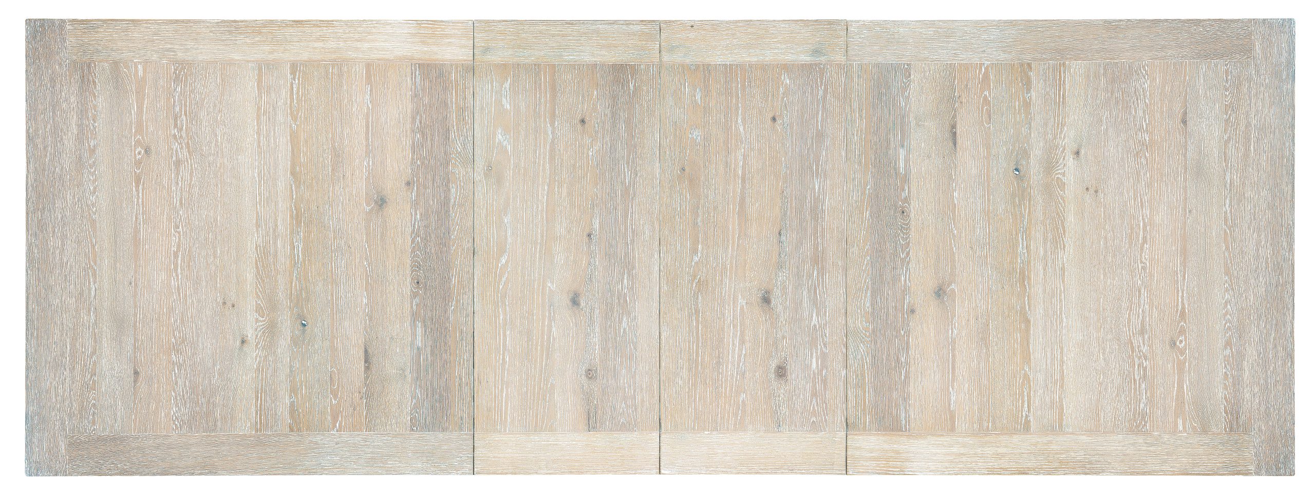 Inspired by casual waterfront living, the Topsail Rectangle Dining Table is crafted of Oak Veneers finished in the light and airy whitewashed Surf finish. The distinct pedestal base has a bold circle motif on each end. The table will accommodate 6 coordinating side chairs and 2 coordinating arm chairs without the two leaves, and will accommodate 8 side chairs and 2 arm chairs with the two 18-inch leaves in place. Leaves extend the table to 122 inches long.