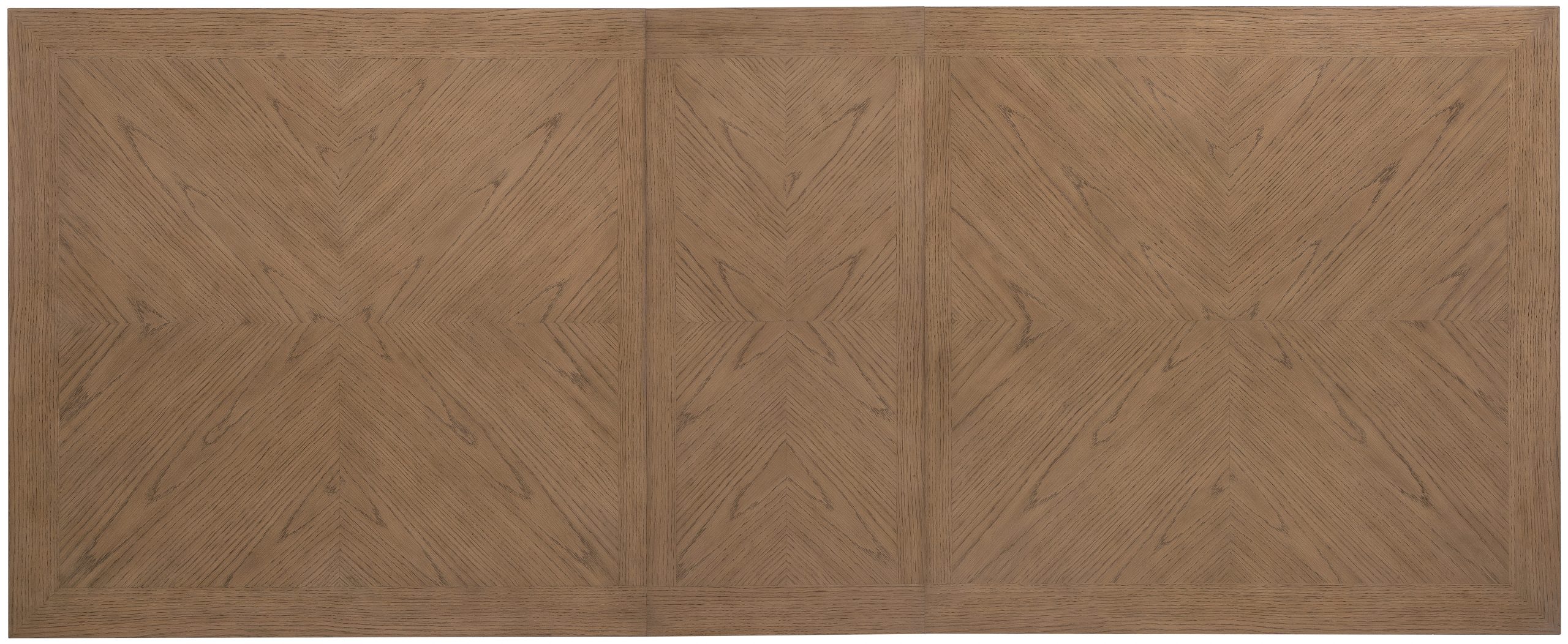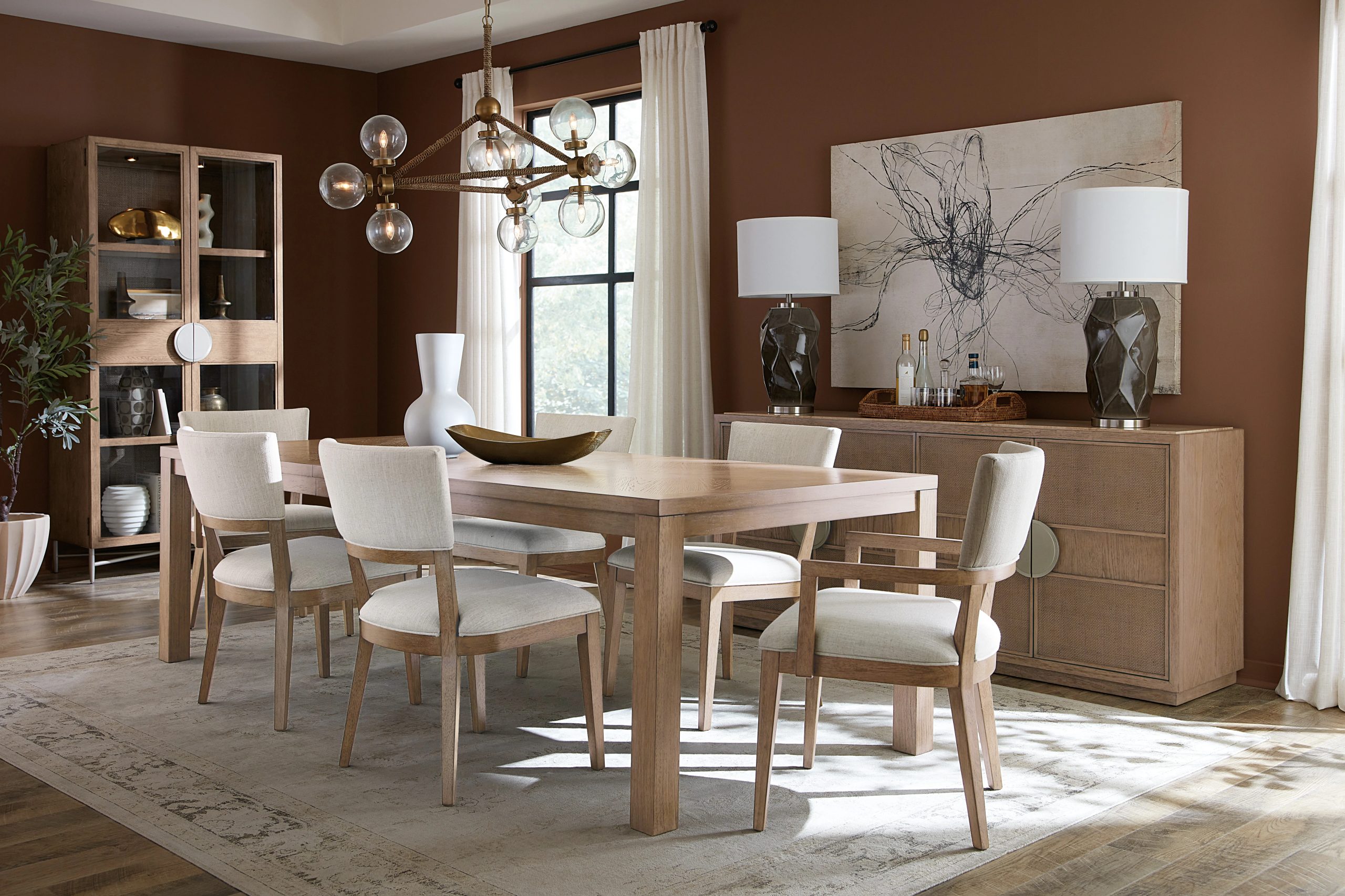 | One 18-inch leafLeaf extends table to 102-inches longRectangle shapeFinish: Wren: quartered and cathedral-cut white oak veneers in a light earthen-toned finish. Matching woven split cane door frontsDistressed Finished: Wire brushing | Yes |