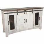 60″ TV Stand w/4 doors & Shelves inside 100% solid pine, great durability and value • Two tone, multi-step lacquer finish. Weathered white finish on hand- distressed wood. • Mortise and tenon construction ensures stability and durability on all pieces. • Solid wood floated tops allow for wood’s natural movement. • Non-chip, custom pulls are durable and unique • Barn doors with gliding mechanism adds authentic rustic charm. • Side doors feature iron mesh on panels. • All shelves are fixed. Dimensions: 34.75″H x 60″W x 19″D