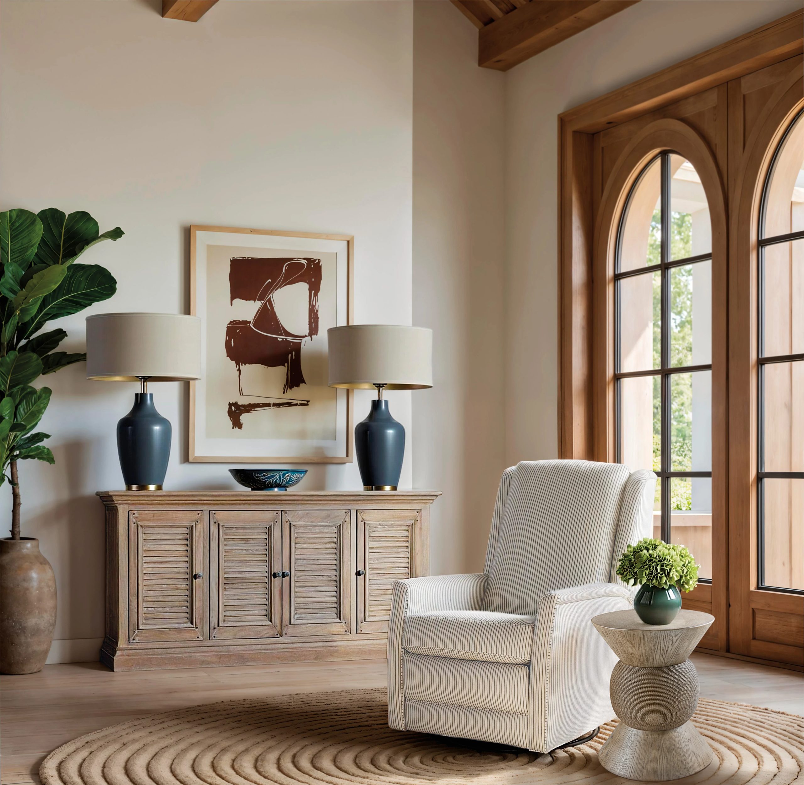 | Four doorsTwo outer doors have one adjustable shelf behind eachTwo center doors have two adjustable shelves behindFinish: Light natural finishDistressed Finished: Sandblasting | Yes |