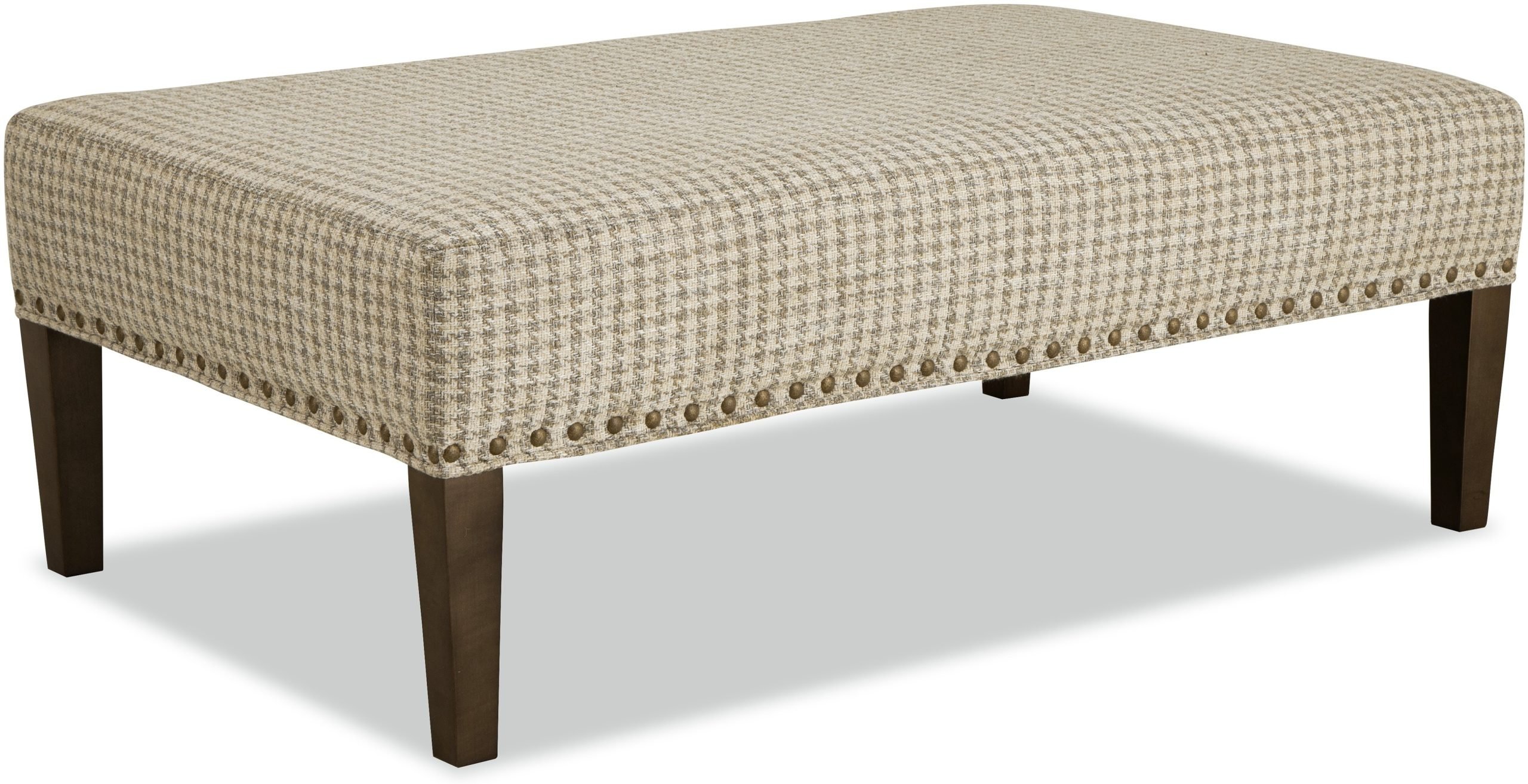 A simple, but versatile piece for any room, this cocktail ottoman features tall tapered legs and brass nail head trim around the entire base. Optional nail finishes available. Also available without nail head trim as style number 078300.