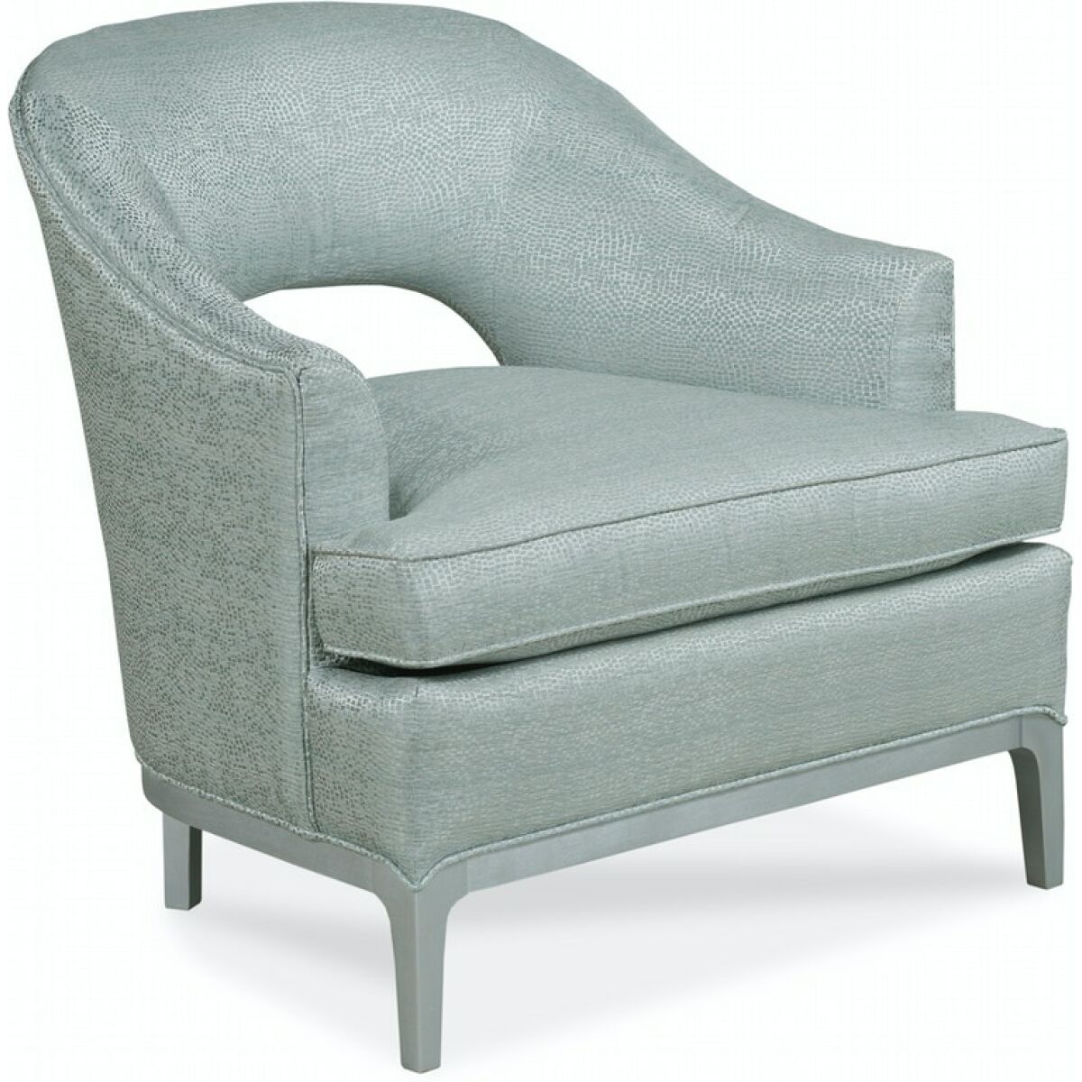 JAMIE LOUNGE CHAIR This is an elegant contemporary chair featuring a barrel shaped back with an opening at the seat level. Wood outlines the base of the chair and tailored welting adds sculpted shaping. The slim simple arm shape flows from the back. Overall: W32 x D30.50 x H32 Inside: 22 Seat Height: 20.5 Seat Depth: 24 Arm Height: 23.5