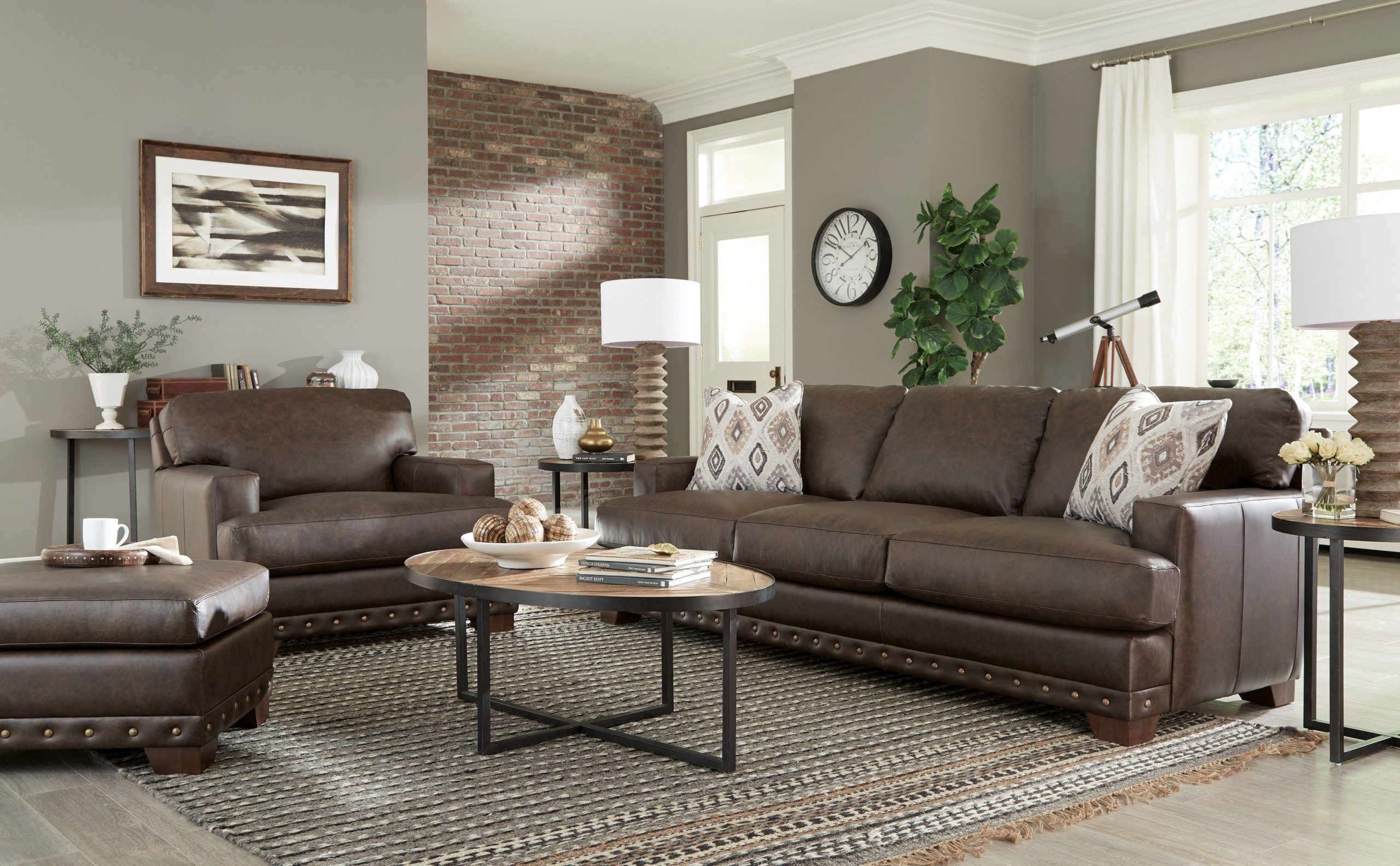 With architectural shaping and bold nail head detailing, this leather sofa has a casual appeal as well as amazing comfort. Deep seated, and generously scaled at 100”, there is plenty of room to relax. It features semi-attached backs, Blend Down Coil cushions, and track arms. Also available are the matching loveseat, chair 1/2 and ottoman. This style is standard with one pair of Blend Down toss pillows in your choice of fabric. Also available without nail head trim.