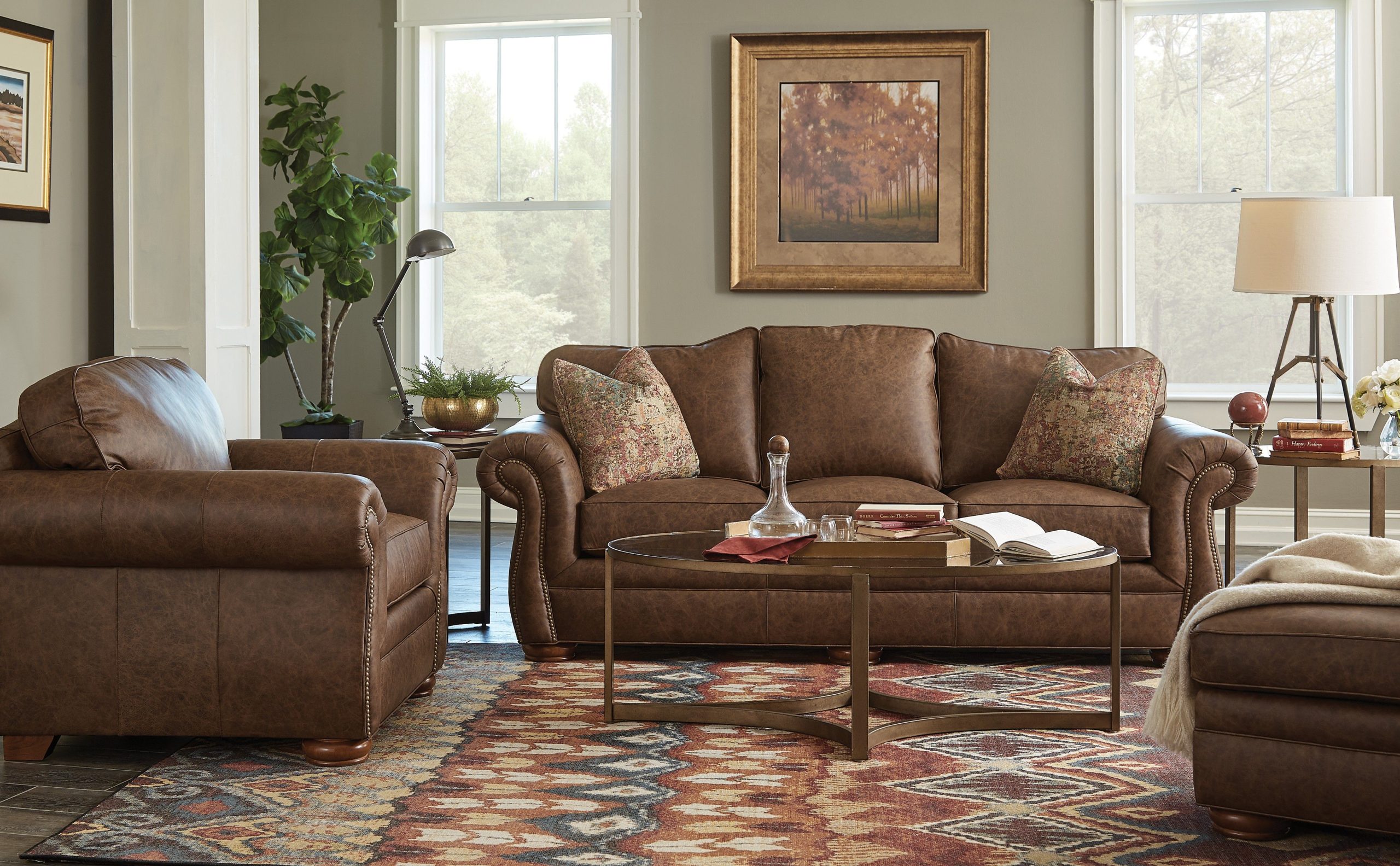 A timeless classic! This 3 seat leather sofa features beautiful Bombay shaped arms with nail head trim and a graceful camel back. Also notice the casual bun feet and plush attached backs for easy maintenance. Blend Down Coil seat cushions add a luxury feel to this popular and well crafted sofa. This style is standard with one pair of Blend Down toss pillows in your choice of fabric. Matching loveseat, chair and ottoman available as well. Optional nail finishes available.