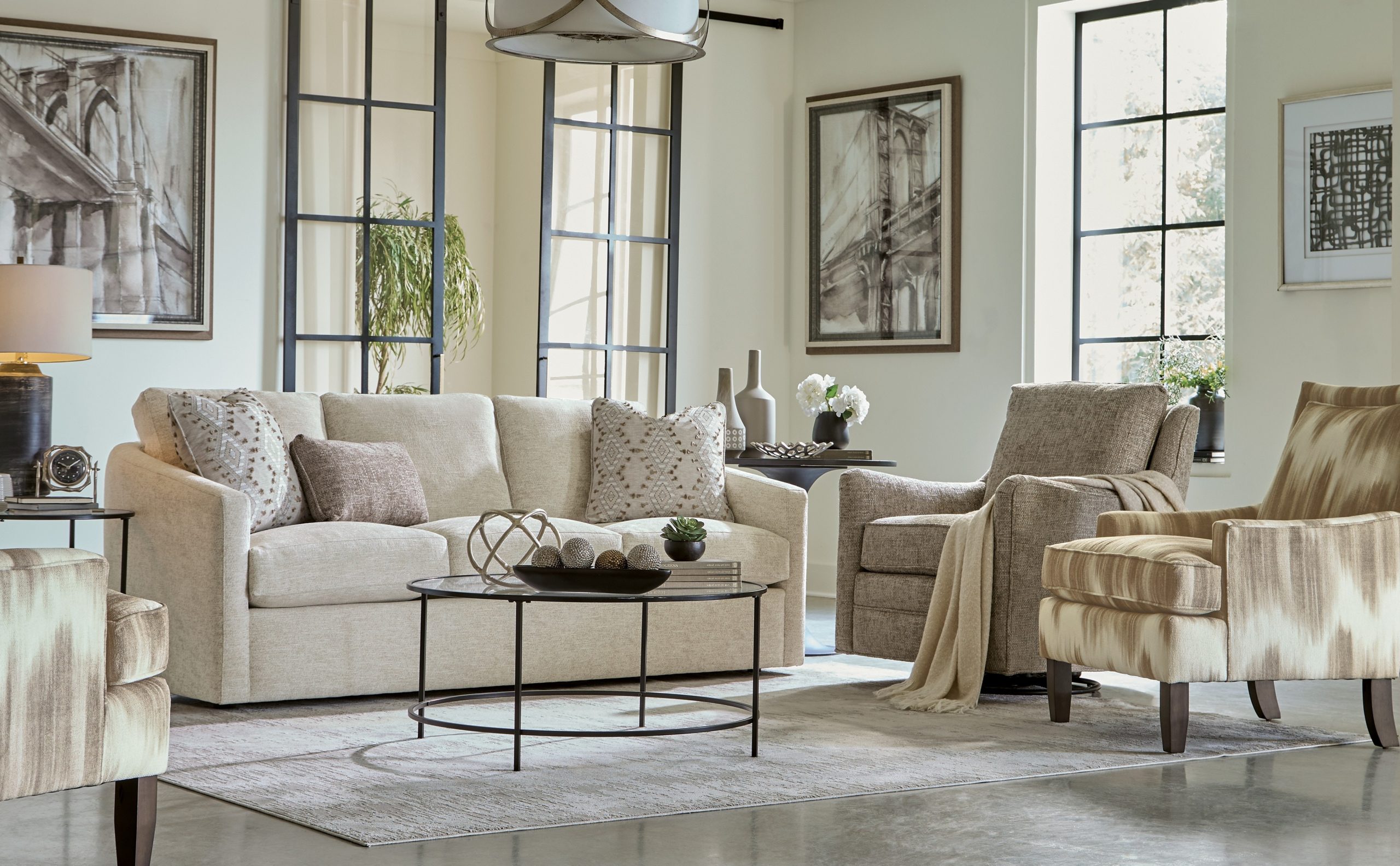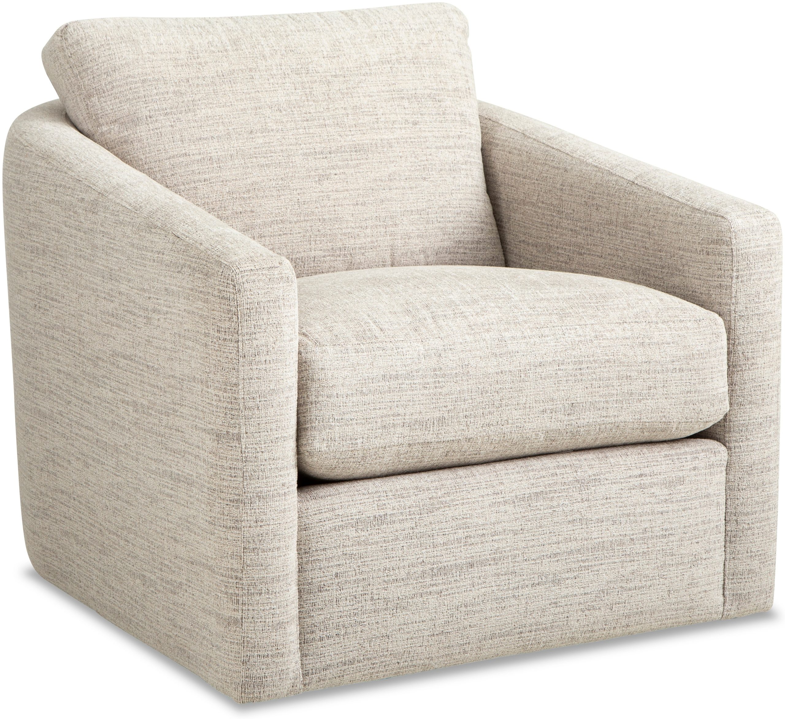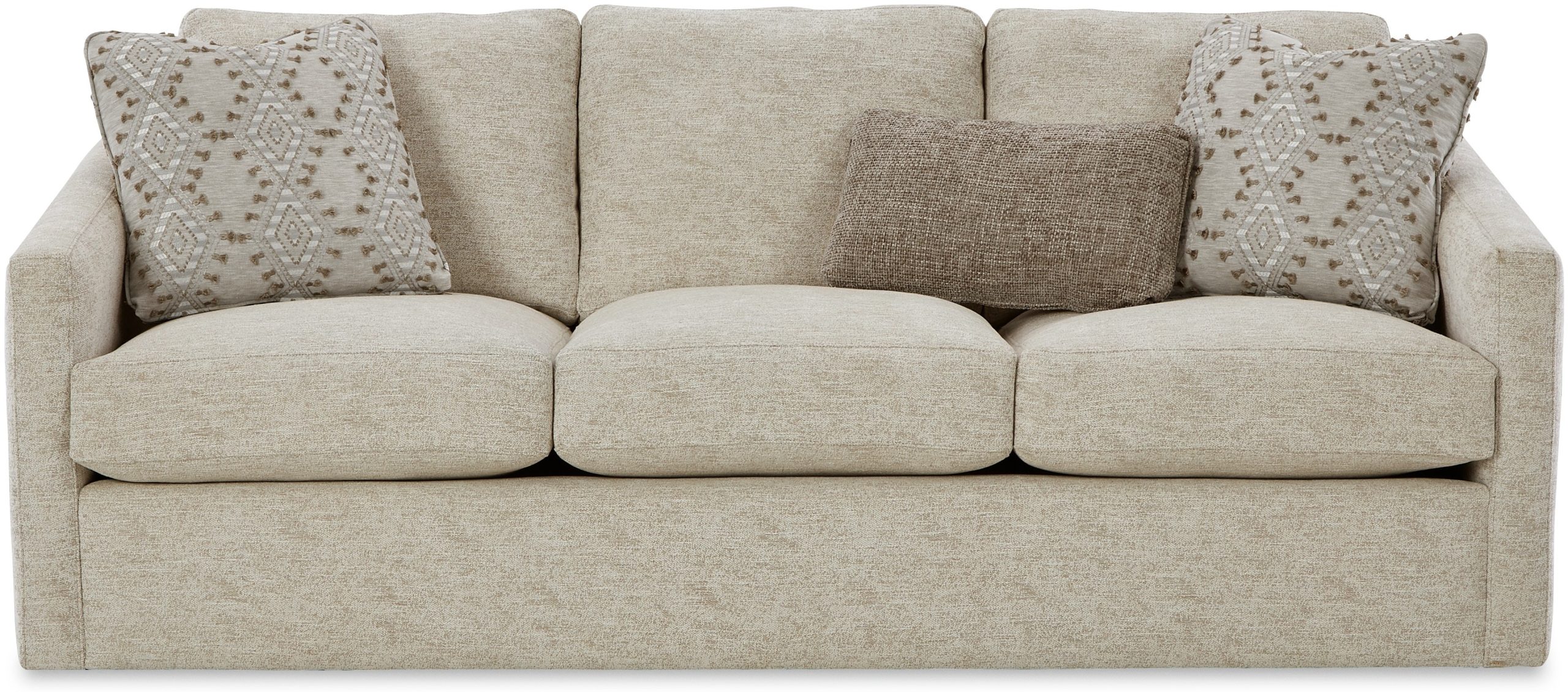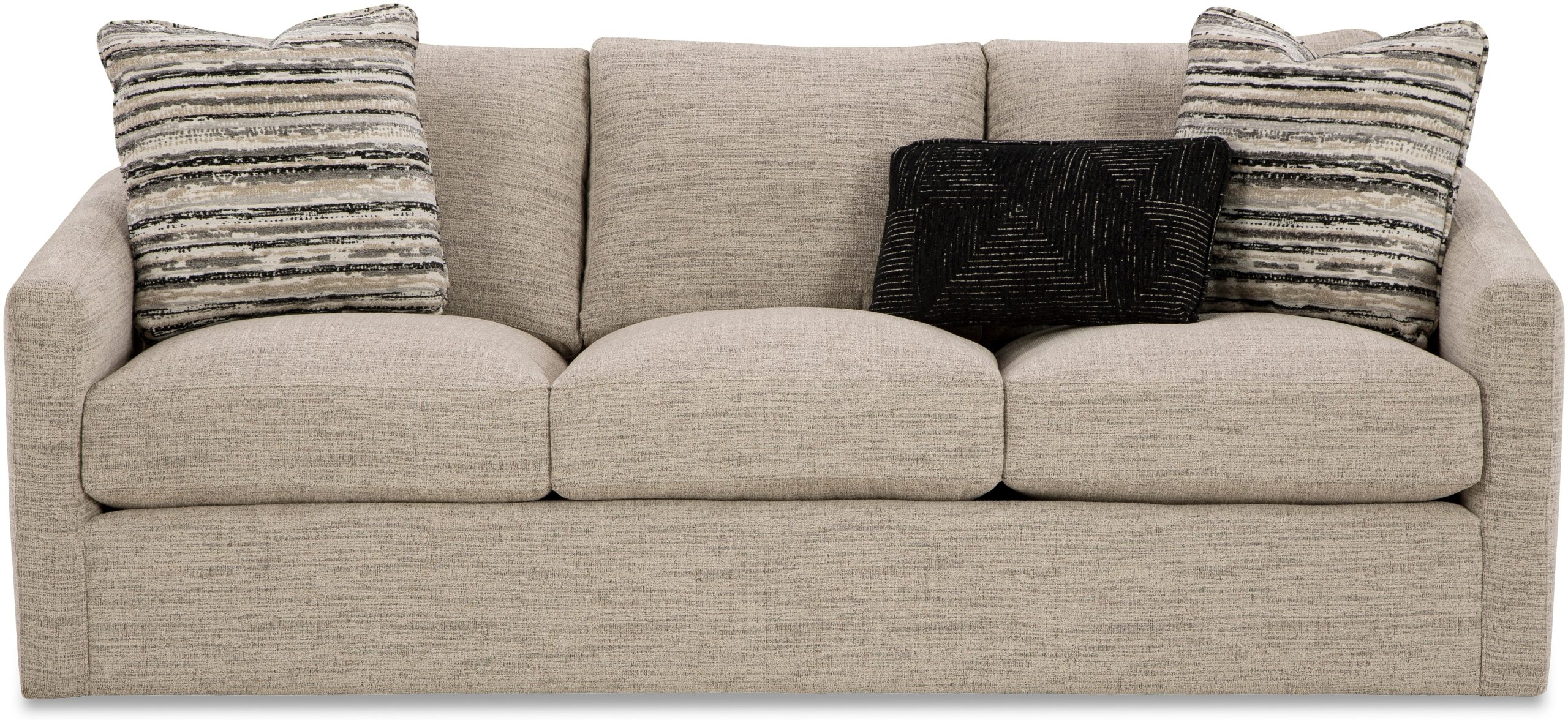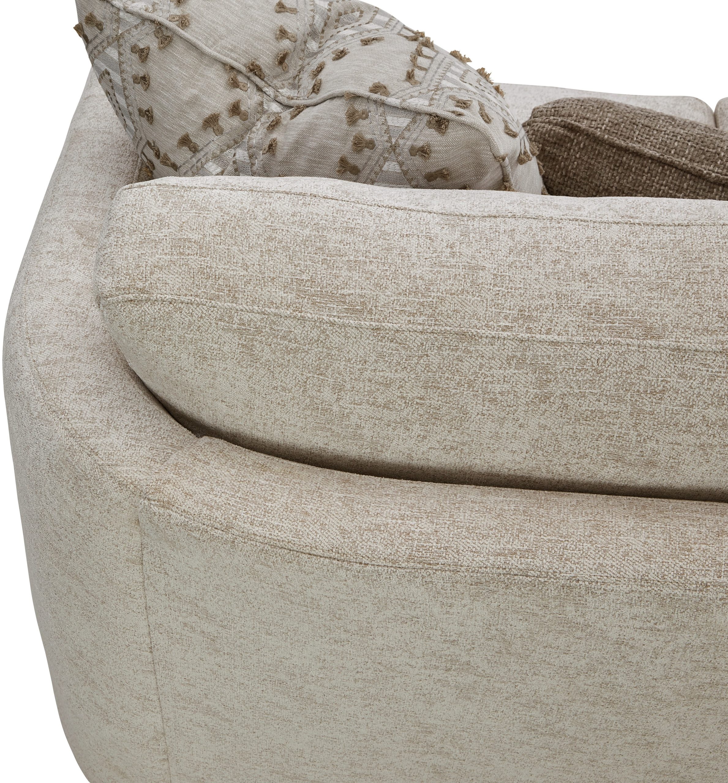 Make a statement with this chic and curvy style from our CM Modern collection. It features a high sloping track arm that wraps into a beautiful curve around the back, catching your eye from every angle. French seamed all over to give a clean and modern aesthetic, this piece has loose box border back pillows and plush Blend Down seat cushioning. Also available are the matching loveseat, chair, swivel chair, ottoman and sectional.