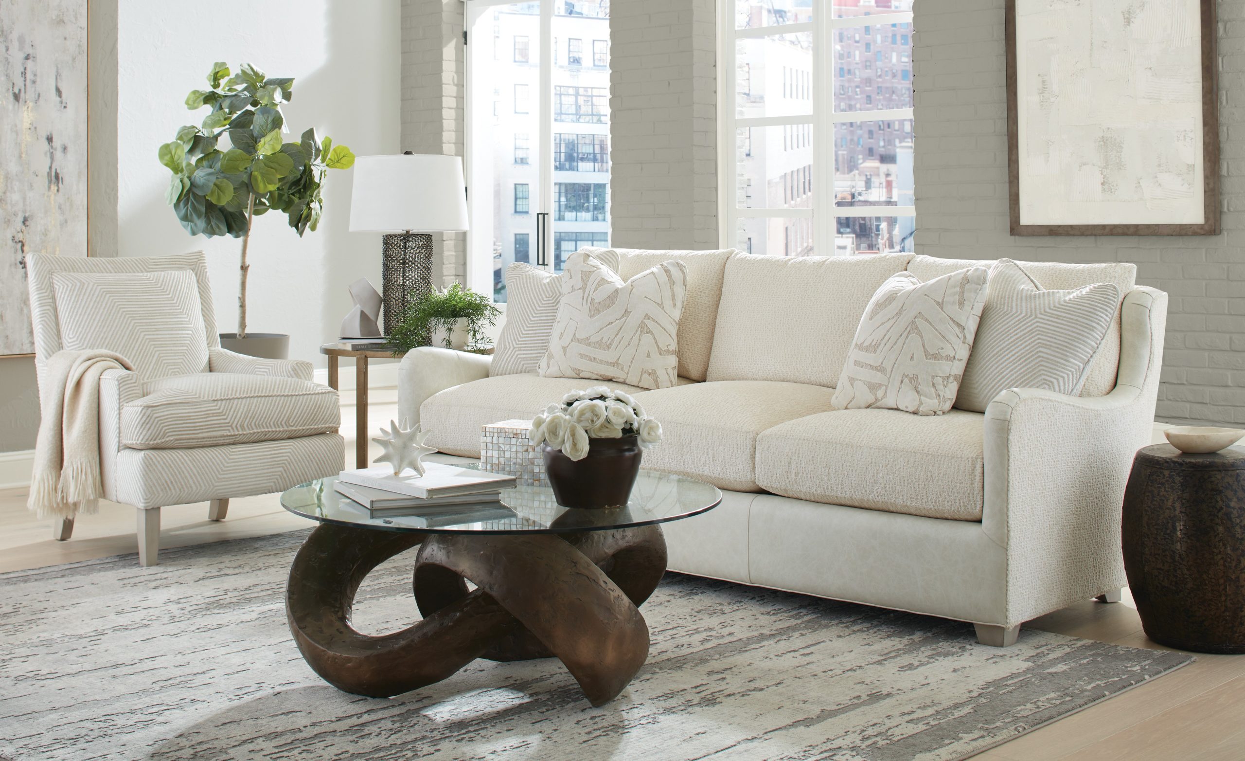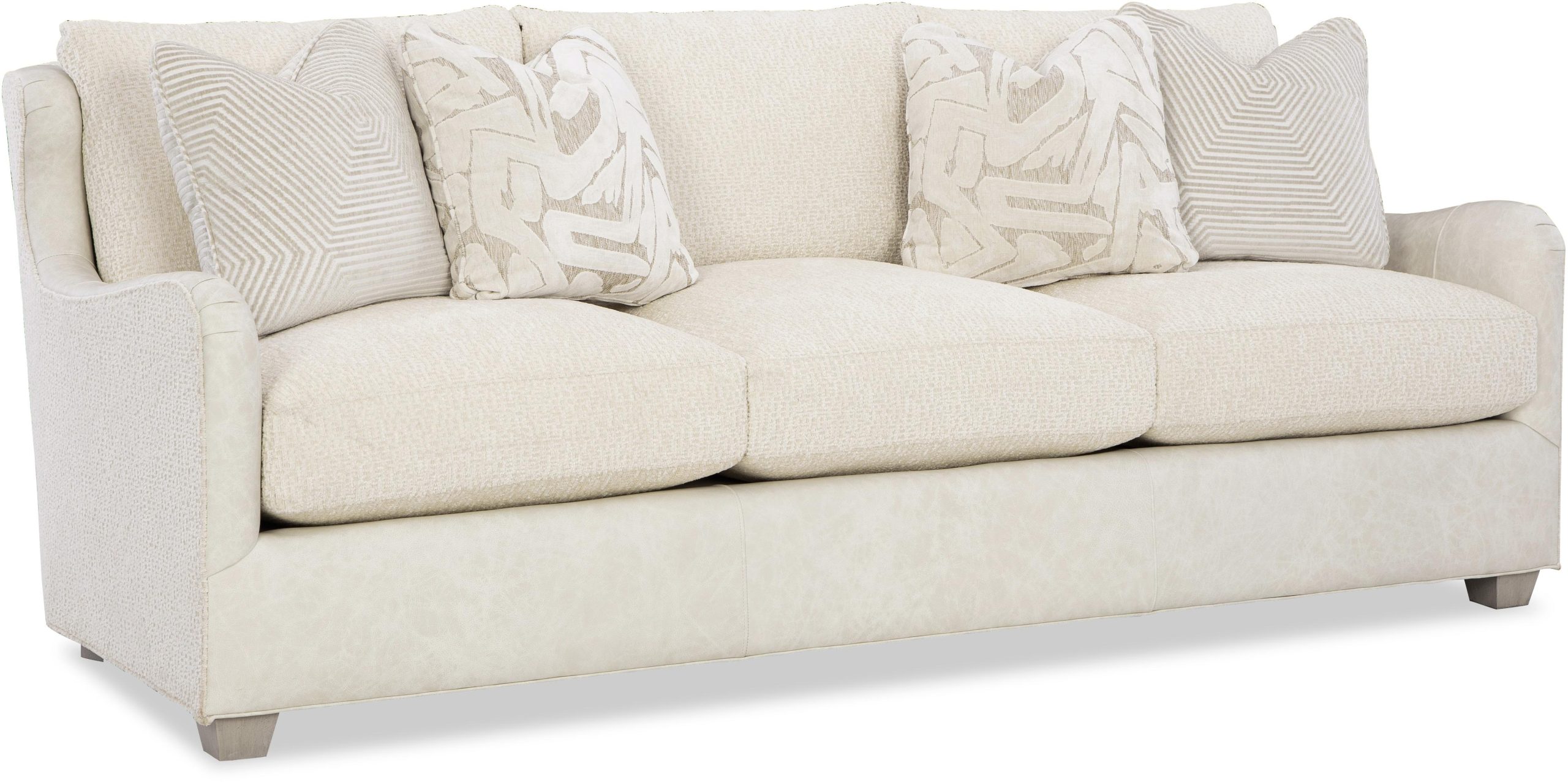 Beautiful organic shaping gives this sofa a casual, welcoming detail that is sure to inspire. Covered in both leather and fabric, it has a unique blended look that can be fully customized with any fabric and leather in our line. (see the Custom Blends order form for details about how to order this). Curvy English arms flow gracefully into the sculpted wing back. Plush Blend-Down Coil seating and loose back pillows wrap you in relaxing comfort. Two pairs of LuxDown toss pillows standard. Also available are the matching loveseat, chair, and ottoman. To order in all leather, see style L7329. To order in all fabric, see style 7329.