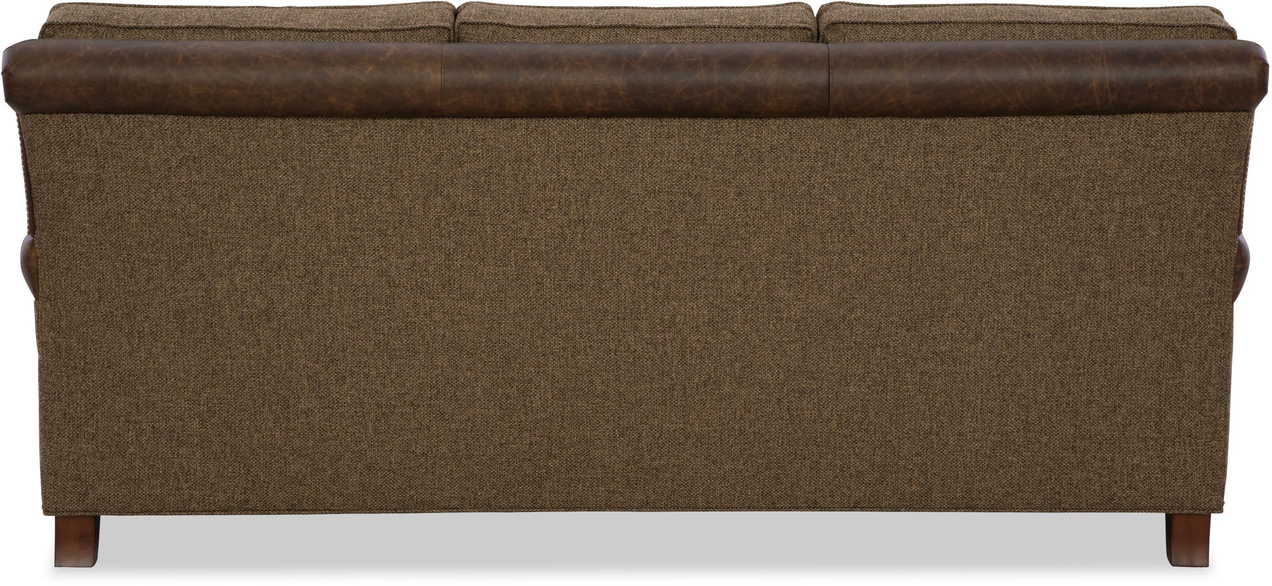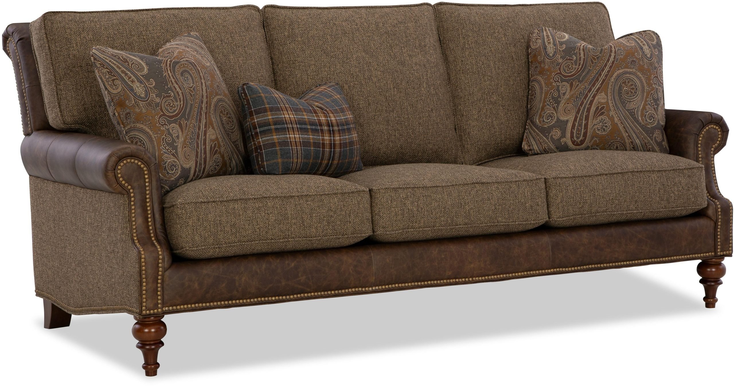 Classic traditional details and nail head trim accents are some of the things you’ll love on this gracefully finessed sofa. Covered in both leather and fabric, it has a unique blended look that can be fully customized with any fabric and leather in our line. (see the Custom Blends order form for details about how to order this). It features a rollover back, cut-back rolled arms, and beautifully turned legs that offer a familiar heirloom touch. Loose box border back pillows and Blend Down Coil seat cushions. Standard with 3 Luxdown toss pillows. Optional nail finishes available. Also available are the matching loveseat, chair 1/2, and ottoman. Also available without nail head trim. To order in all leather, see style L7482. To order in all fabric, see style 7482.