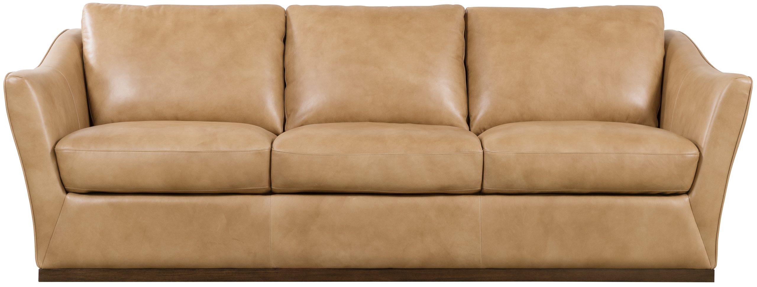 Timeless yet casual, the Fairfax Stationary Sofa in Dark Blond leather features a streamlined silhouette with flared arms, a low-profile wood plinth base, and three generously cushioned seats. Welt trim adds refined detail, making this an inviting and stylish anchor for relaxed living spaces.