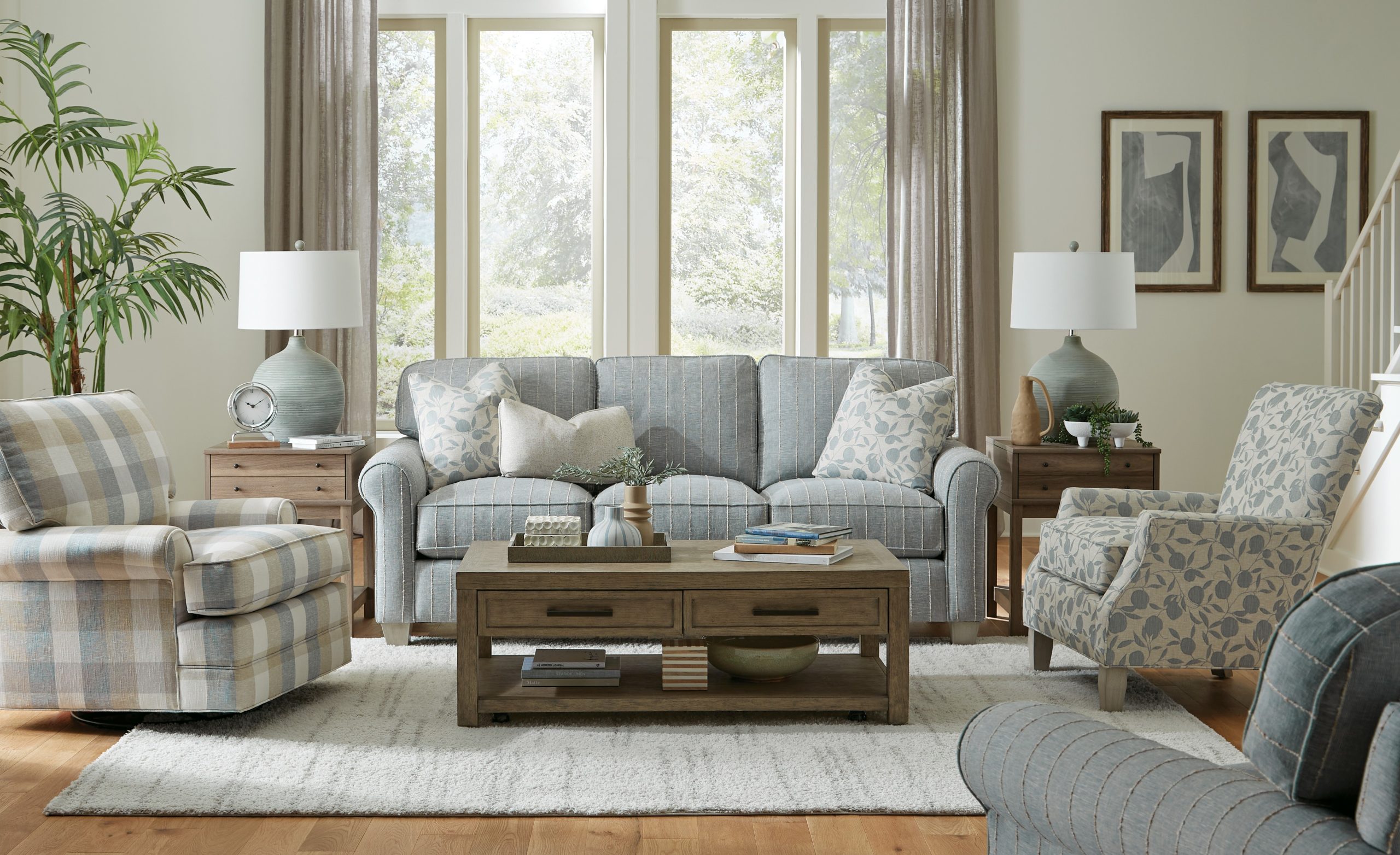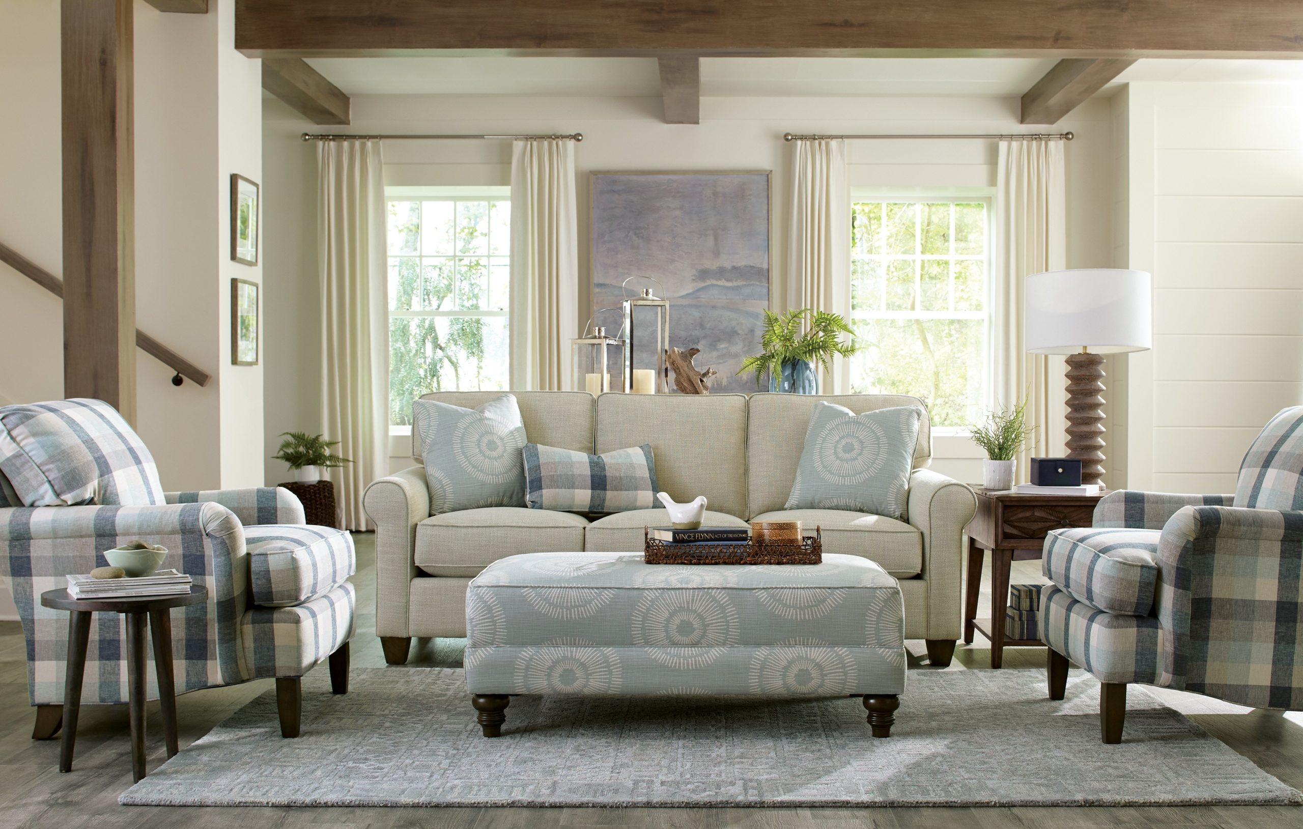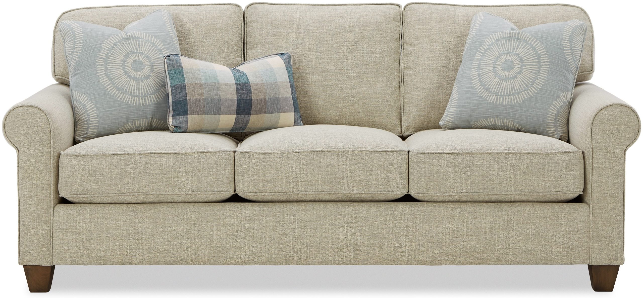 Tradition and Today blend together seamlessly in this classic sofa style. It features loose box border backs and plush Super Soft Blend Down seat cushions and backs for extraordinary comfort, as well as two Luxdown toss pillows and one kidney pillow for a welcoming touch. Sock arms and tapered legs compete the familiar, pulled- together look of this beautifully tailored sofa. Also available as a 2 seat style using style number 717454BD. Also available – matching sleeper, loveseat, chair and ottoman. Also available as a sectional.
