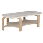 Crystal Wood grain marble top with polished egde. Rope wrapped legs and an oak shelf.