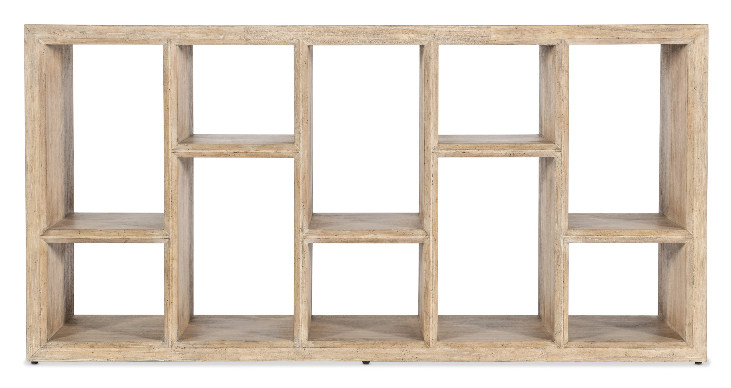In a dynamic design creating an asymmetric assortment of cubbies, the Commerce & Market Console has five fixed shelves creating 10 storage spaces. Crafted of Mindi Solids, it has a light natural wood finish.