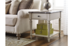 END TABLE With a cozy, updated farmhouse look, Brookhaven is an inviting collection offering bedroom, dining and occasional pieces that will feel at home in multiple settings. The painted, Vintage Linen finish and Rustic Dark Elm finished tops compliment each other and add to the comfortable appeal of this group. Custom hexagon ring pulls and knobs in a dark, Oiled Bronze finish complete the look. Features such as felt-lined and cedar lined drawers, silver trays, built-in outlets and creative storage options add function to this total home collection. 1 Drawer, 1 Shelf 22W x 26D x 25H